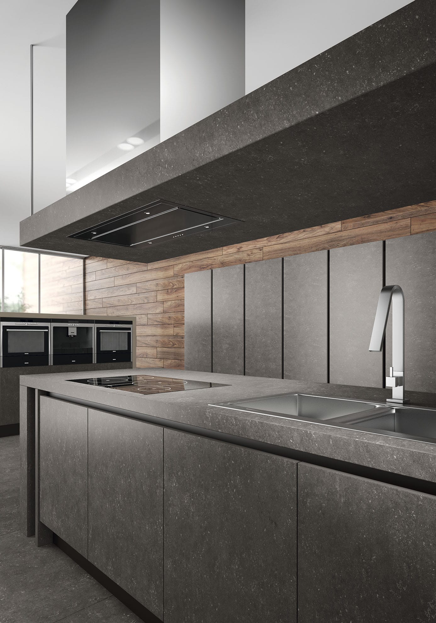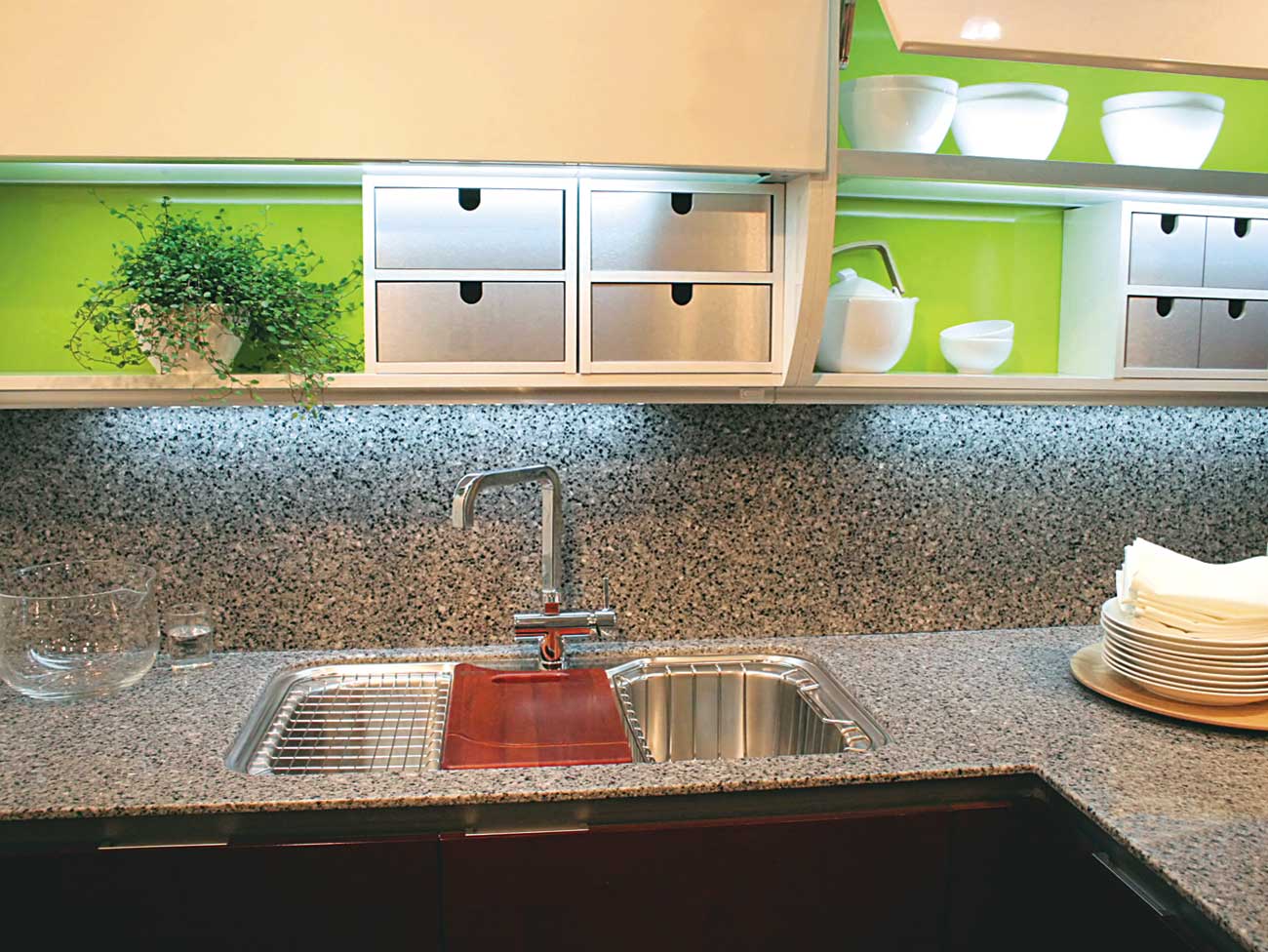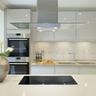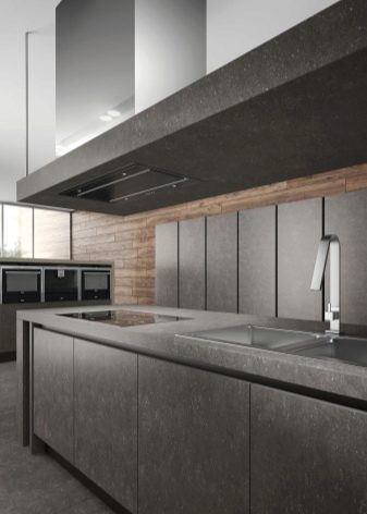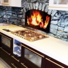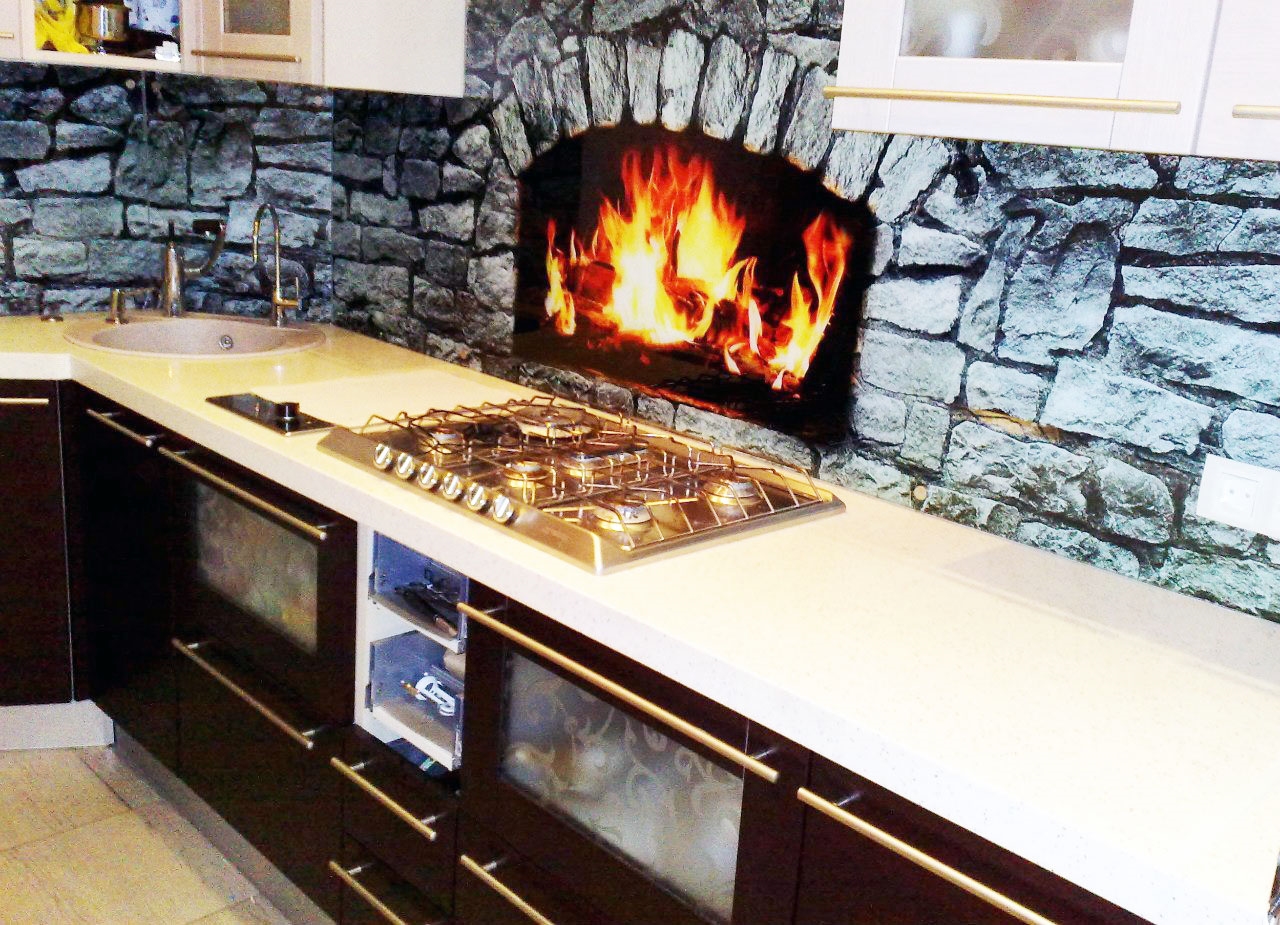 - Temperatures above + 80 ° C can lead to fire with the release of harmful fumes. That is why the area near the slab is better to cover with glass or other more sustainable material. This is especially true when finishing kitchens with gas stoves.