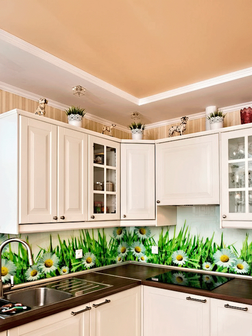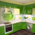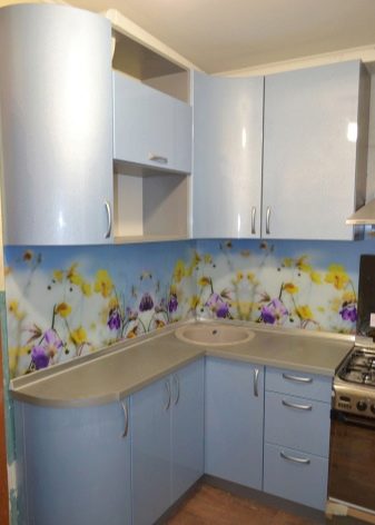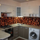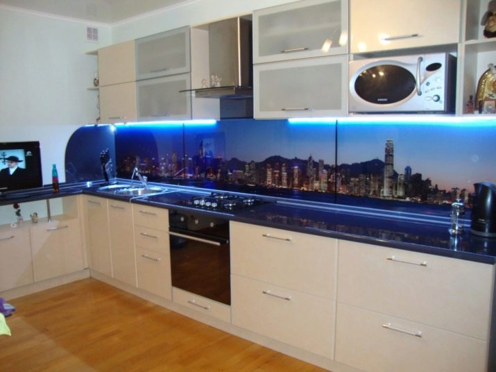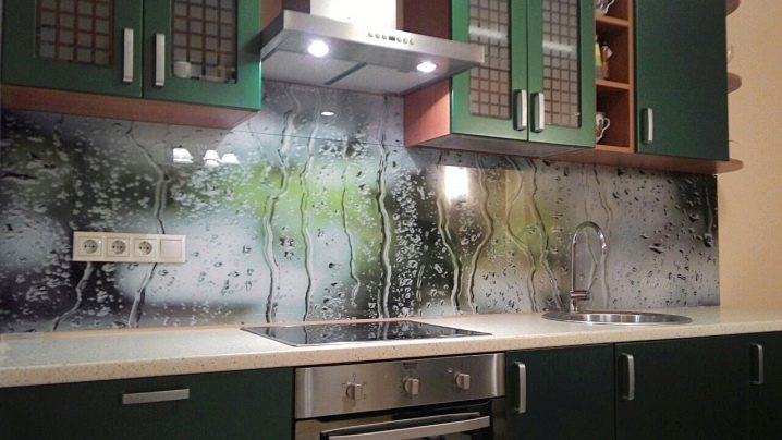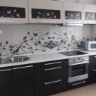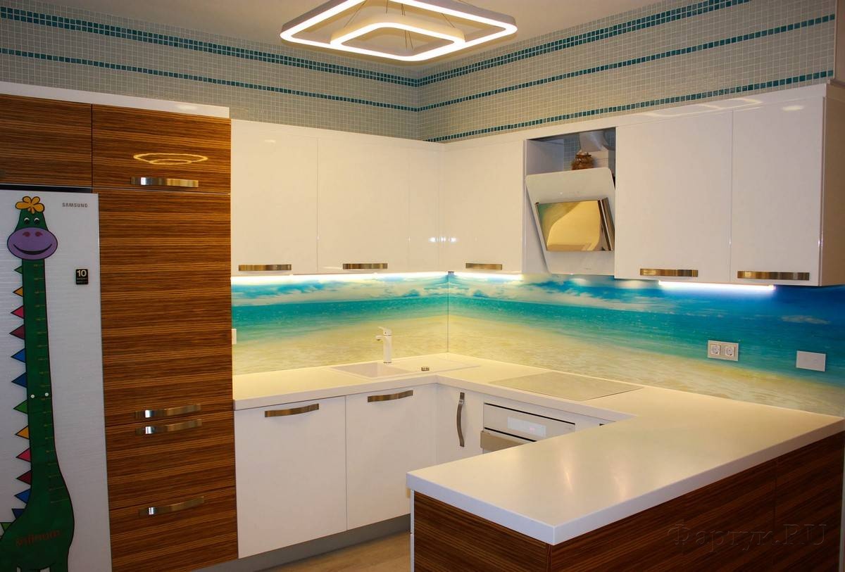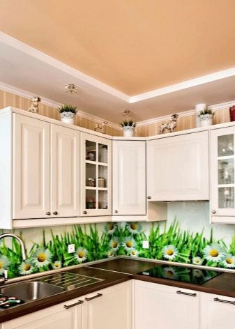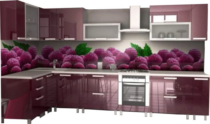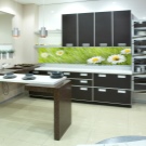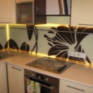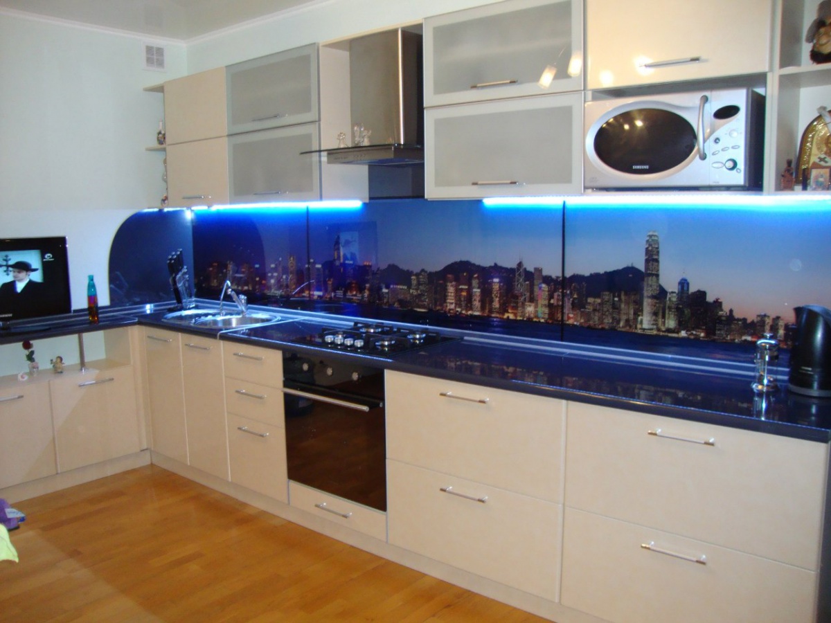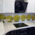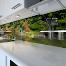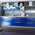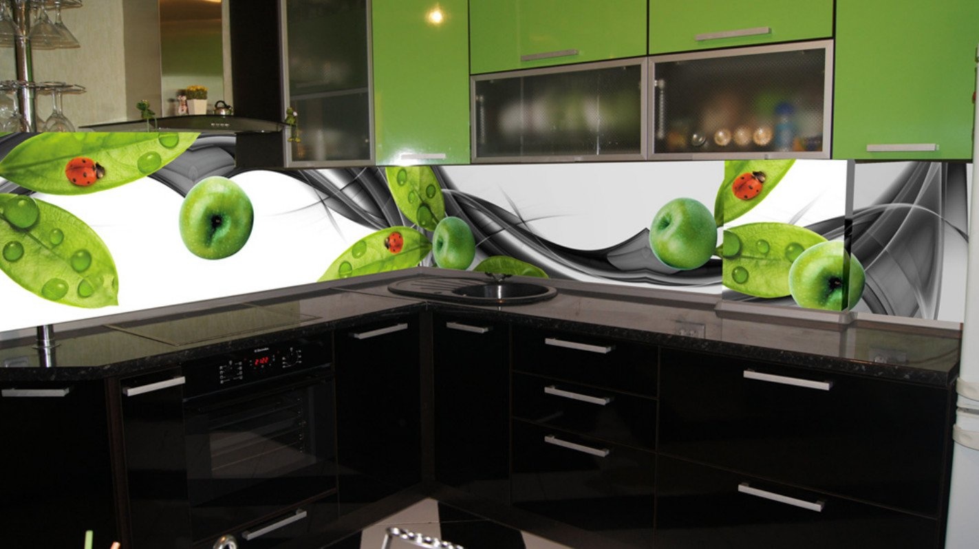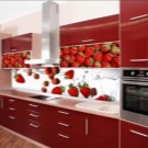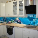 Kitchen aprons with photo printing have a wide range. There are models with 3D printing. Pick a picture so that it fits with the kitchen set. With the help of manufacturers' catalogs, you can familiarize yourself with the most popular options and estimate them to your kitchen.