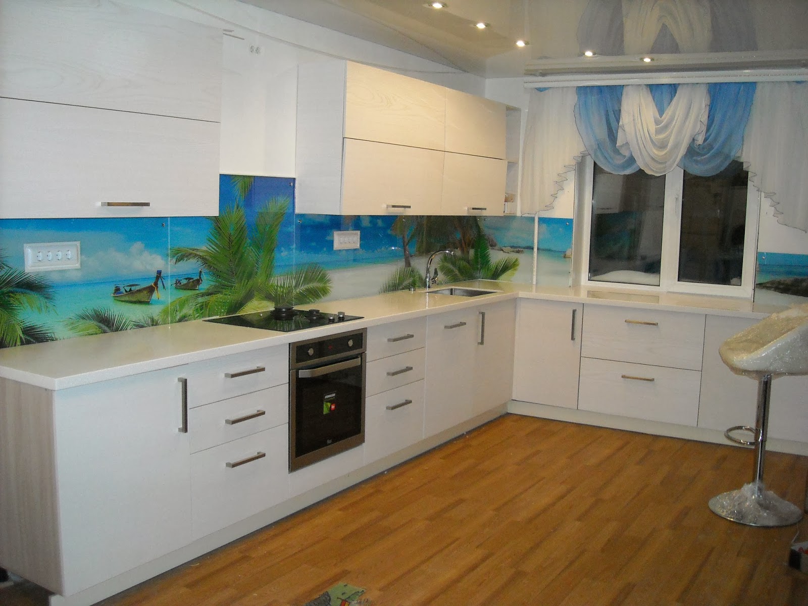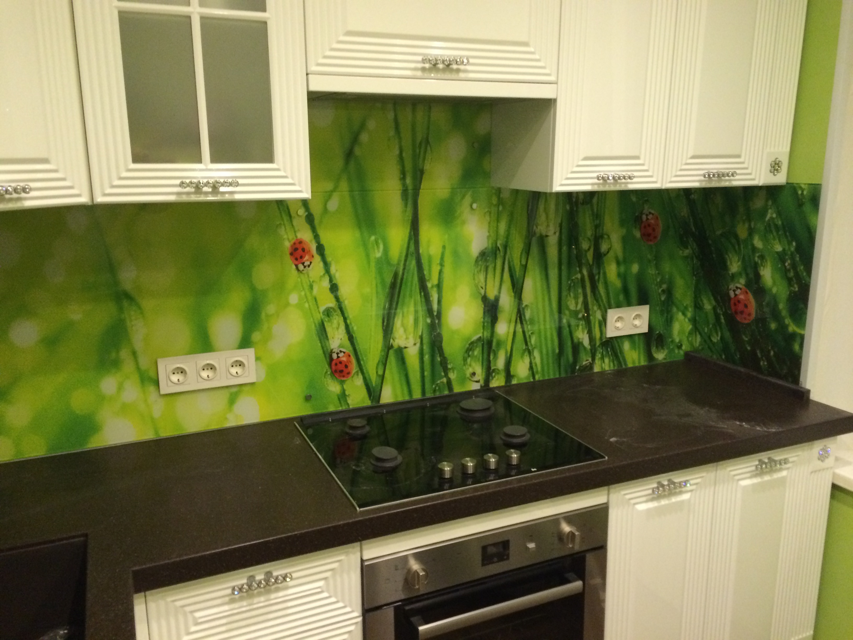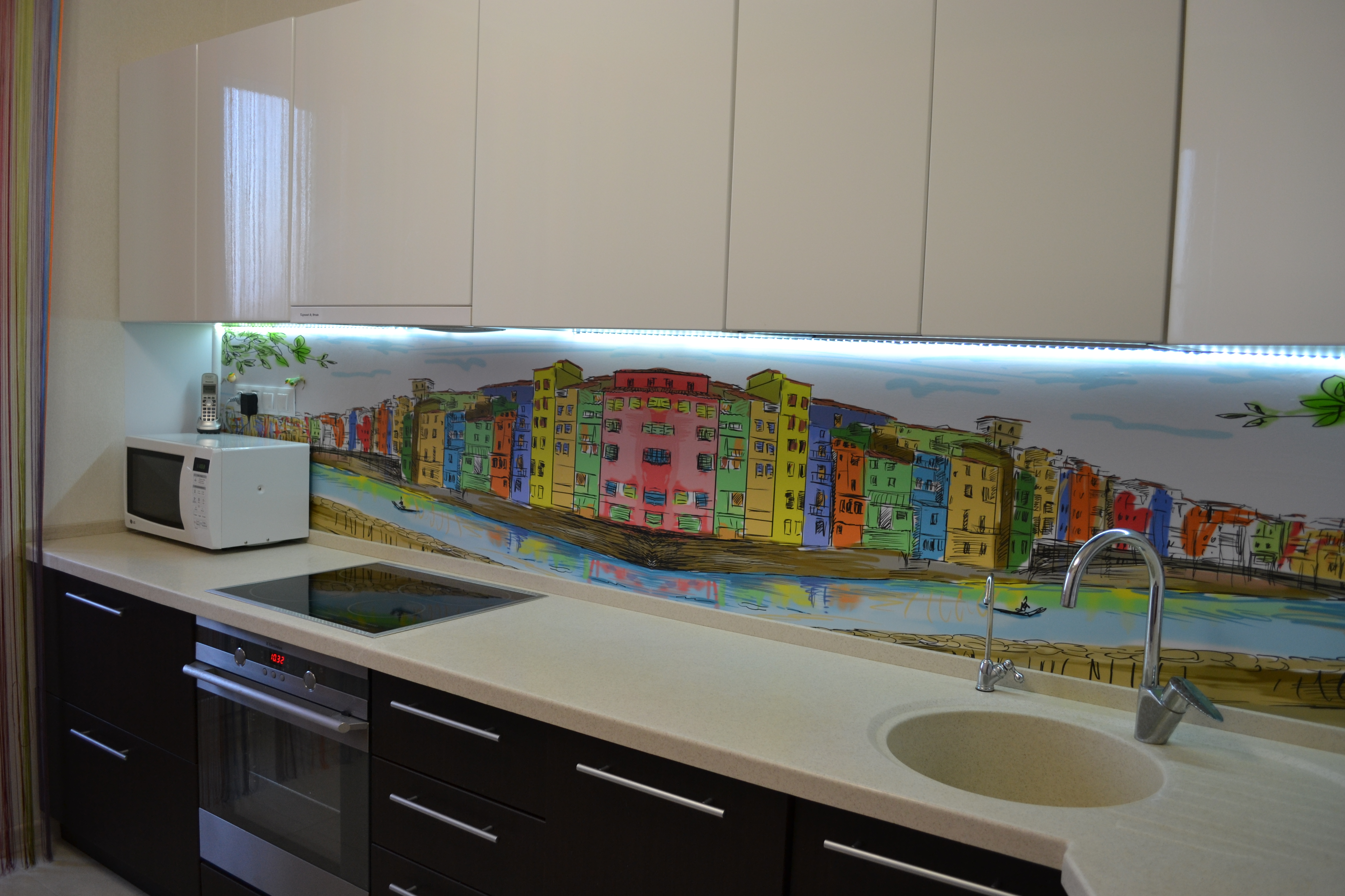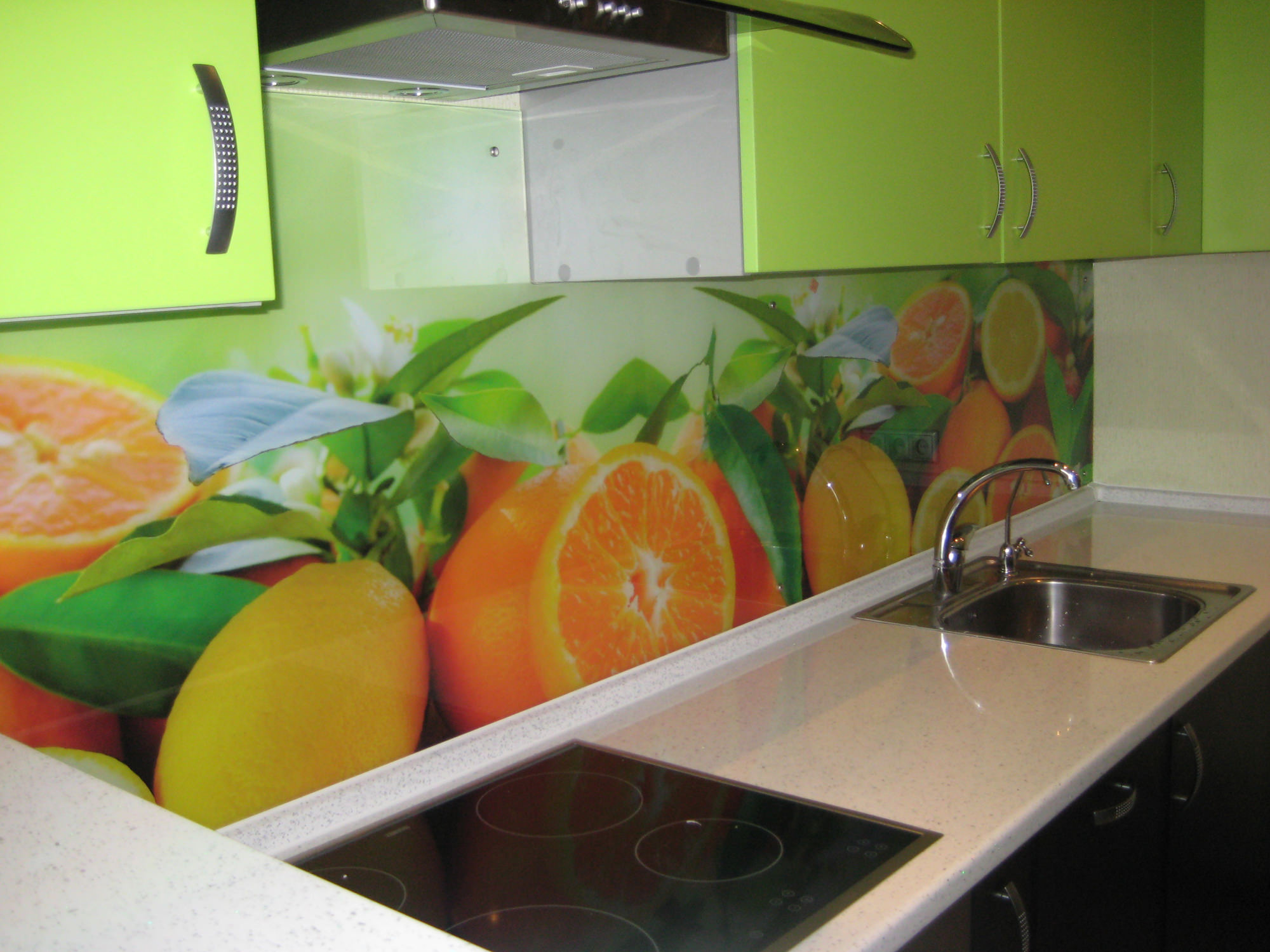 The photo printing can be made under the individual order. Such a solution will let your imagination roam and create a real work of art in the kitchen. To date, many companies offer this service. You can choose any image or photo as a picture. By giving preference to photo printing, you can complement the entire kitchen interior with similar prints.