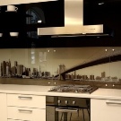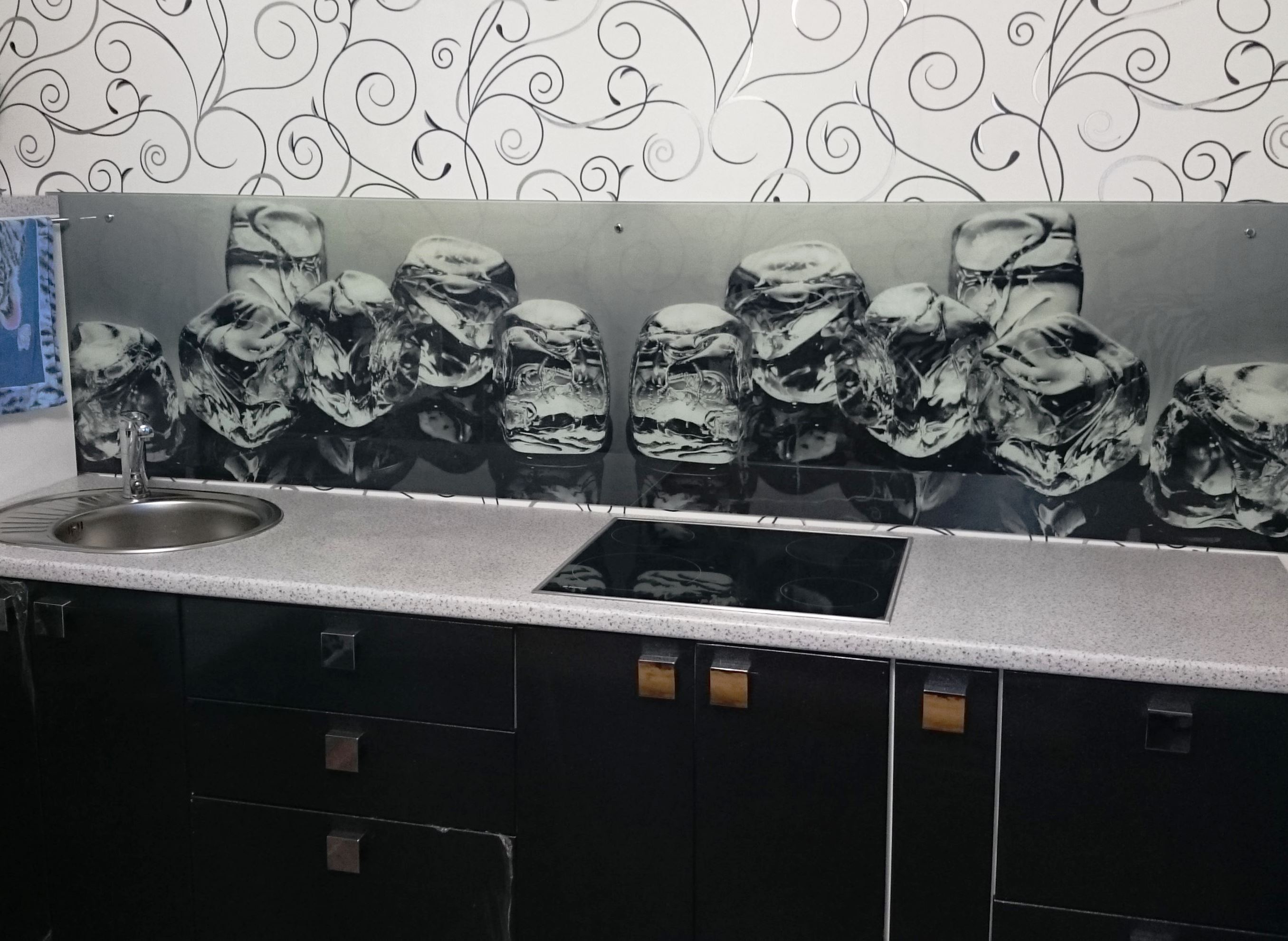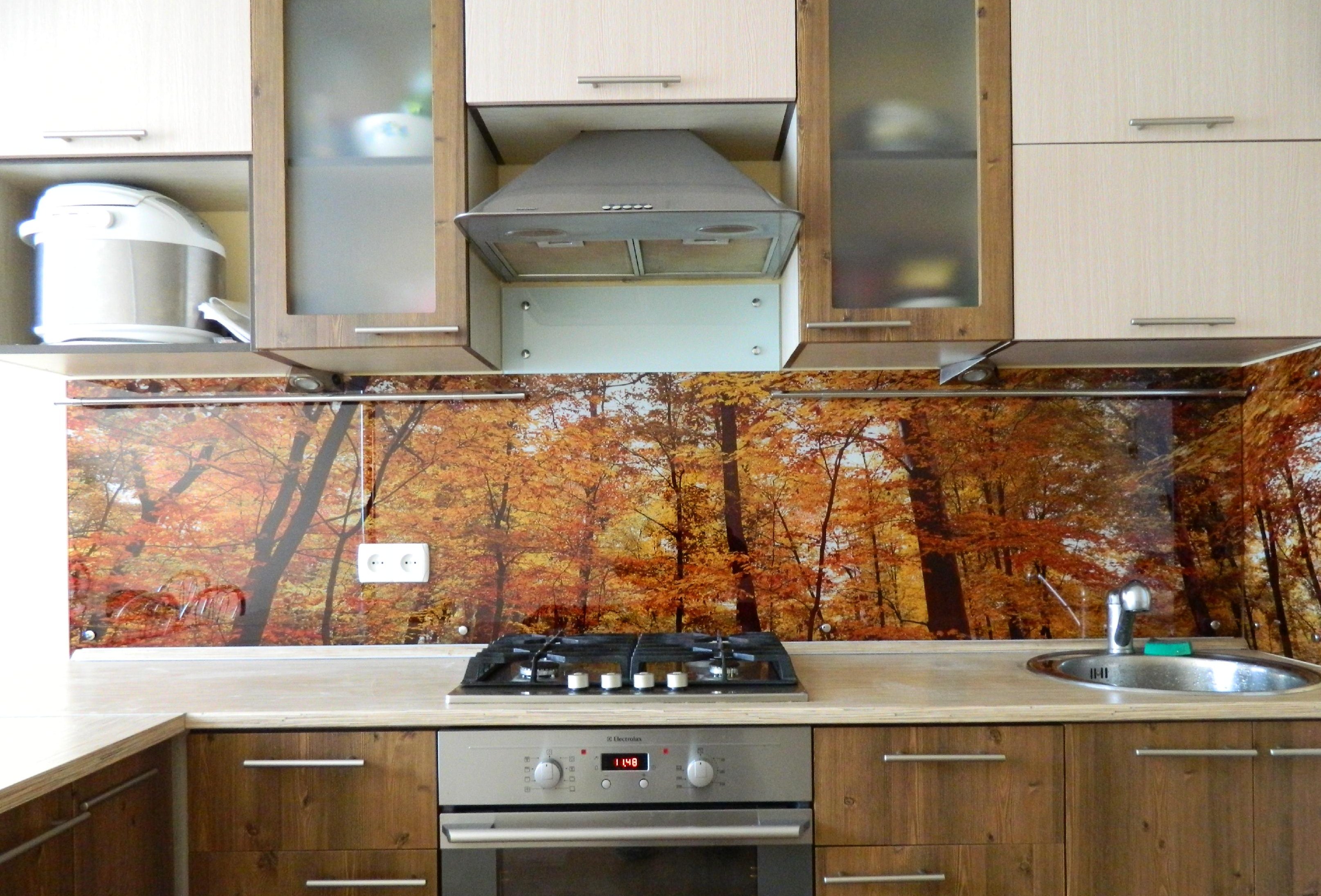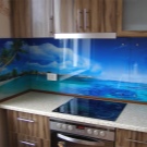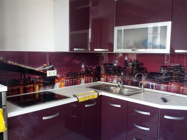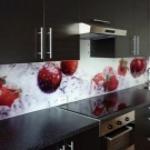 In addition to the tempered, an apron with a pattern can be made of laminated glass or triplex. It is made by gluing several sheets of glass with a special polymer film. Sheets can be silicate, hardened or organic. Due to this, the triplex panel is thicker than that of ordinary or tempered glass - 8 mm. They are also safer - in the event of damage, such glass does not crumble into fragments and is very resistant to temperature extremes.