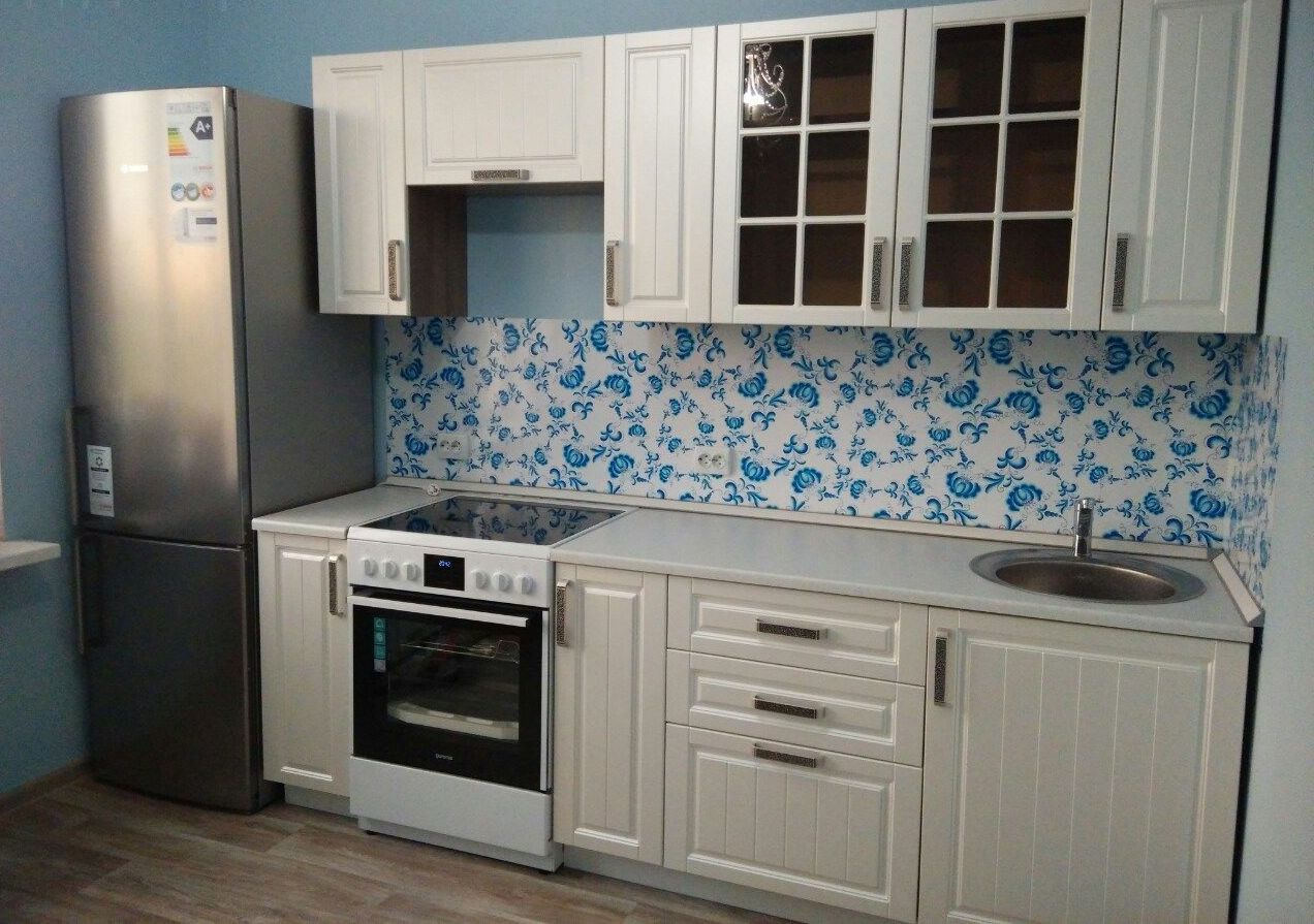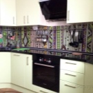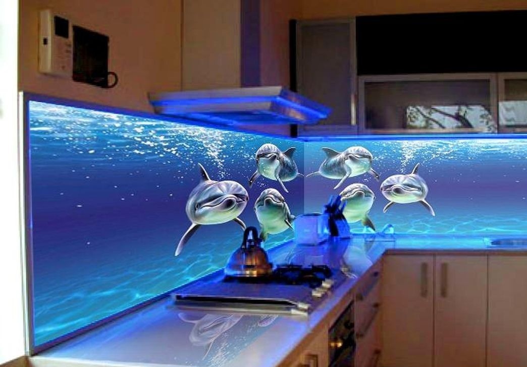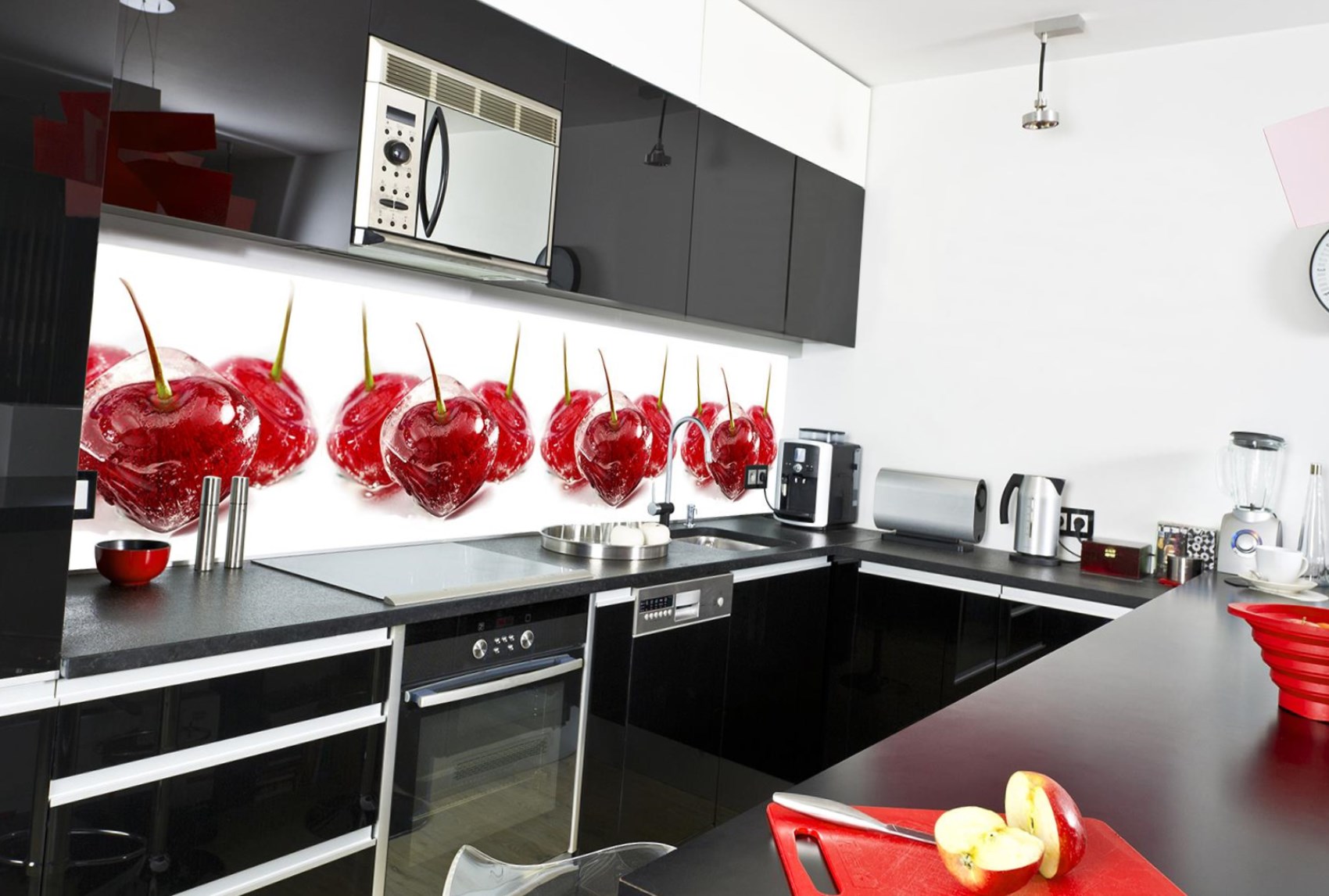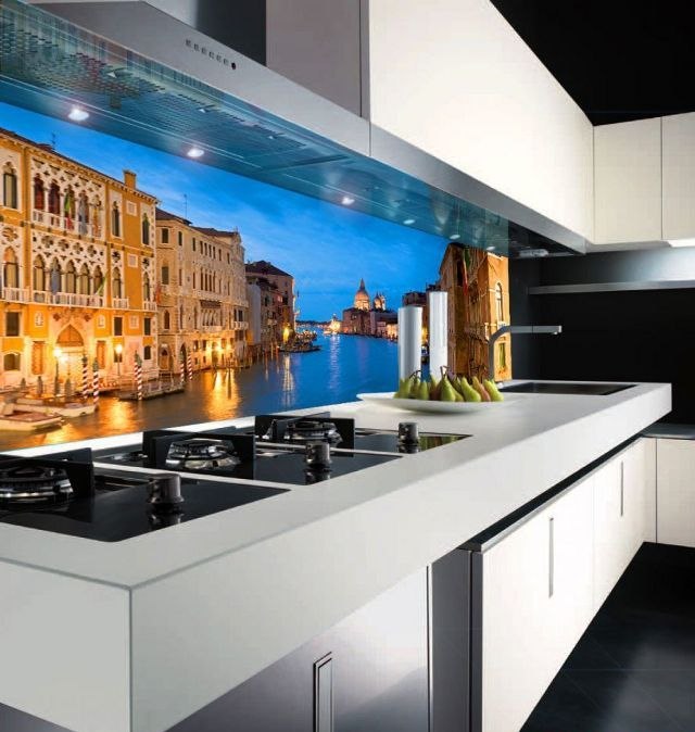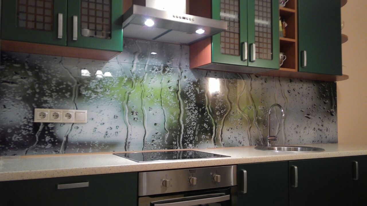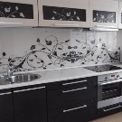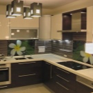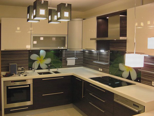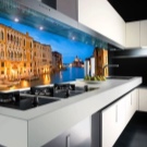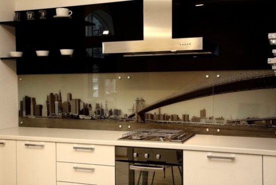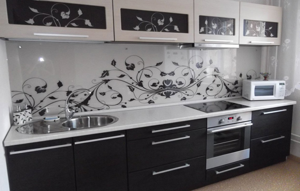 With all the obvious advantages, the disadvantages of glass aprons include their high cost - from 4,700 rubles. per square meter (usually the manufacturer indicates the price, taking into account the figure and installation work). In addition, it should be borne in mind that such panels can not be reinstalled, finished or something in them to change, so all the nuances, the location of sockets and lighting, you must consider in advance.