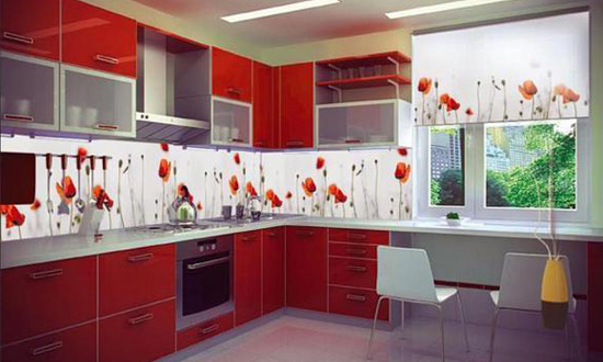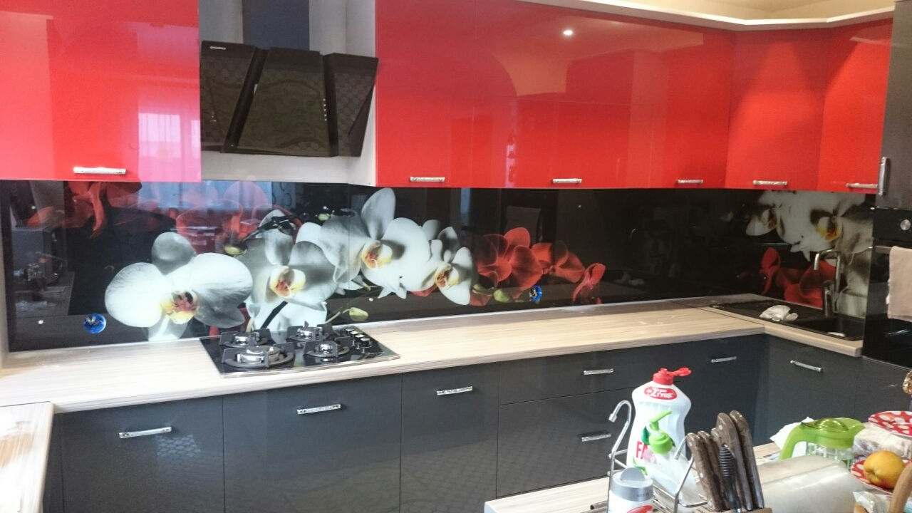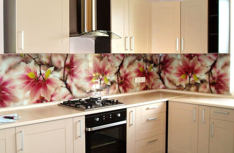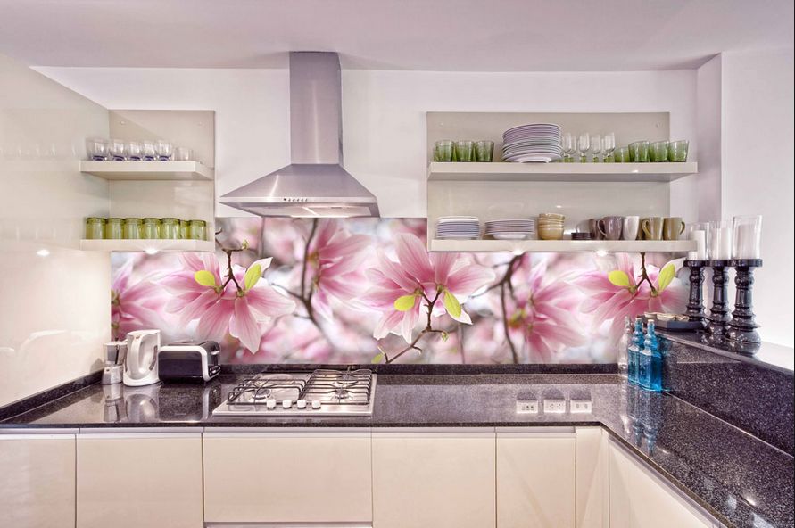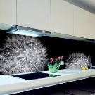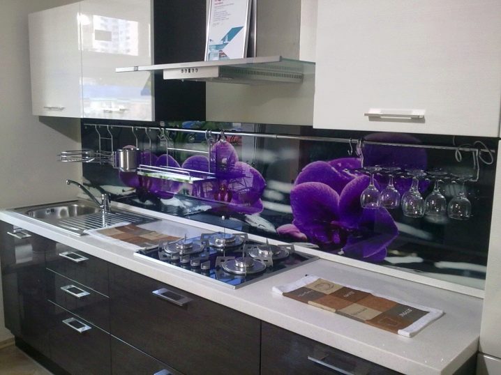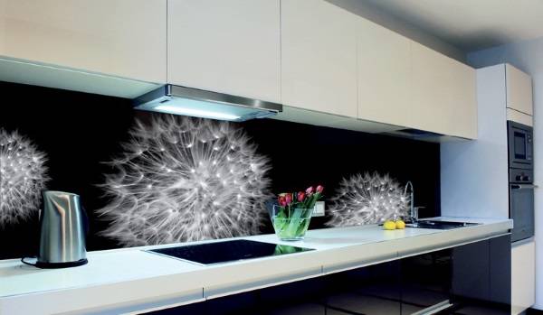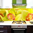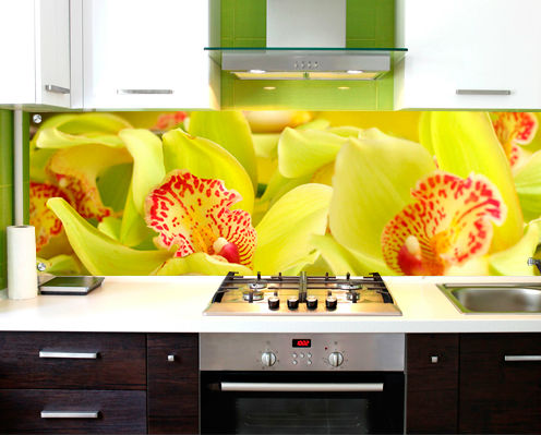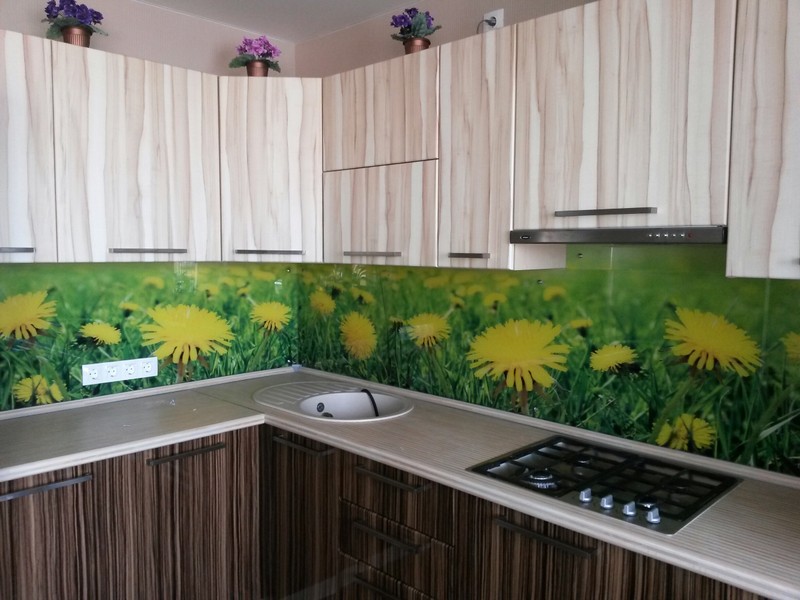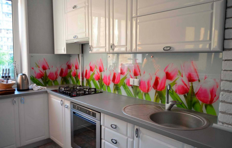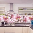 Recently, a variety of floral motifs have become very popular. For example, images of orchids, different juicy tones and elegant lines. A glass apron with red, blue, pink or white orchids does not apply to create its own unique mood in your kitchen and will cause rave reviews from guests.Simple flowers also look very beautiful - large daisies, dandelions, sunflowers.