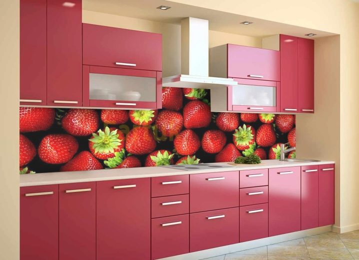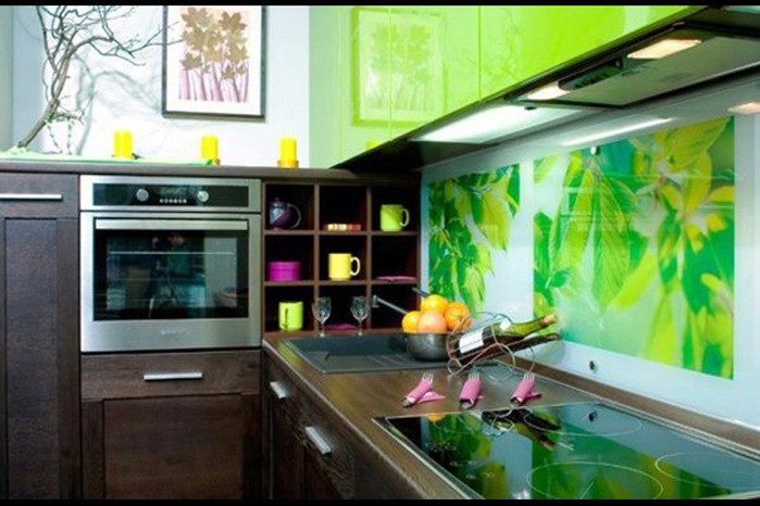 If you install a glass apron for the background, that is, without an image, you can choose the color to match the whole kitchen, and on the principle of contrast.Brightness and dynamism of the interior will give a panel of fuchsia, lime or yellow. If you have a bright headset, then the panel, on the contrary, is better to be white, pale blue or completely transparent.