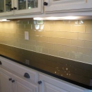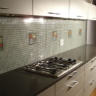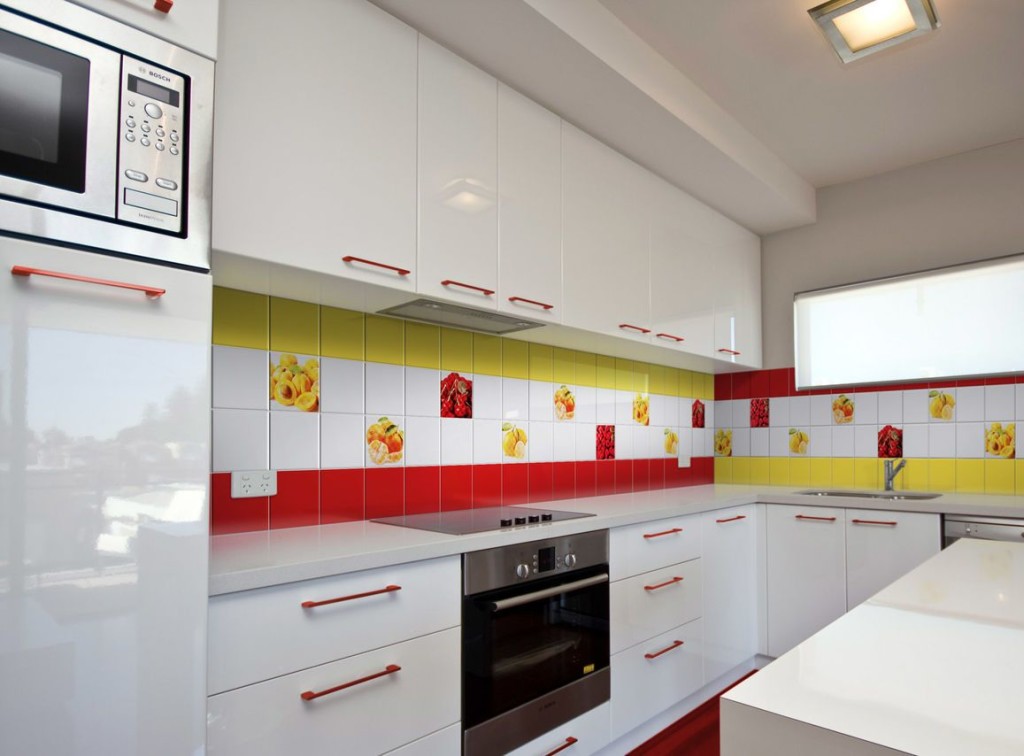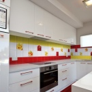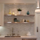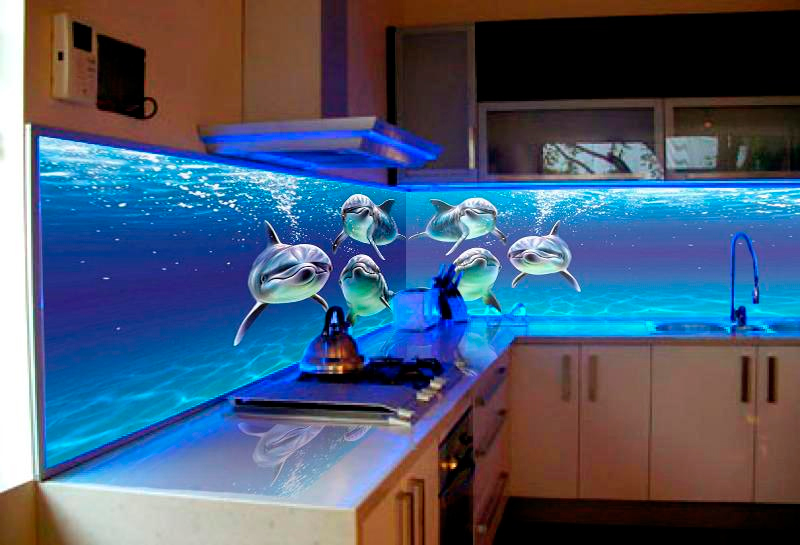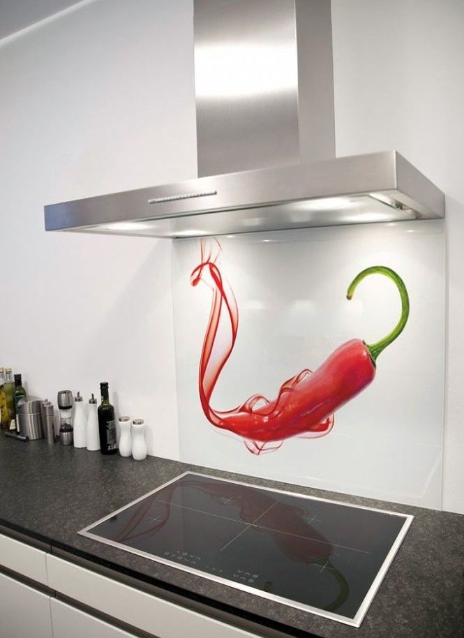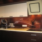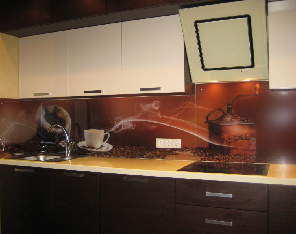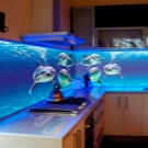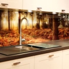 - Few glass tempered glass, stone and porcelain. These are relatively expensive materials, very interesting in the interior. Glass is hardy to moisture, steam and heat, but not always to mechanical shocks. Such materials are used only under the order and they require high precision measurements.
