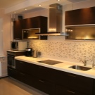 - Another nuance is a side view. If the kitchen set is located at an angle and the joint of all spare parts is visible (canopy, apron, bottom of the headset, wall), then you need to consider aesthetics. So that the kitchen was made in a single design, but the side view was pleasant.