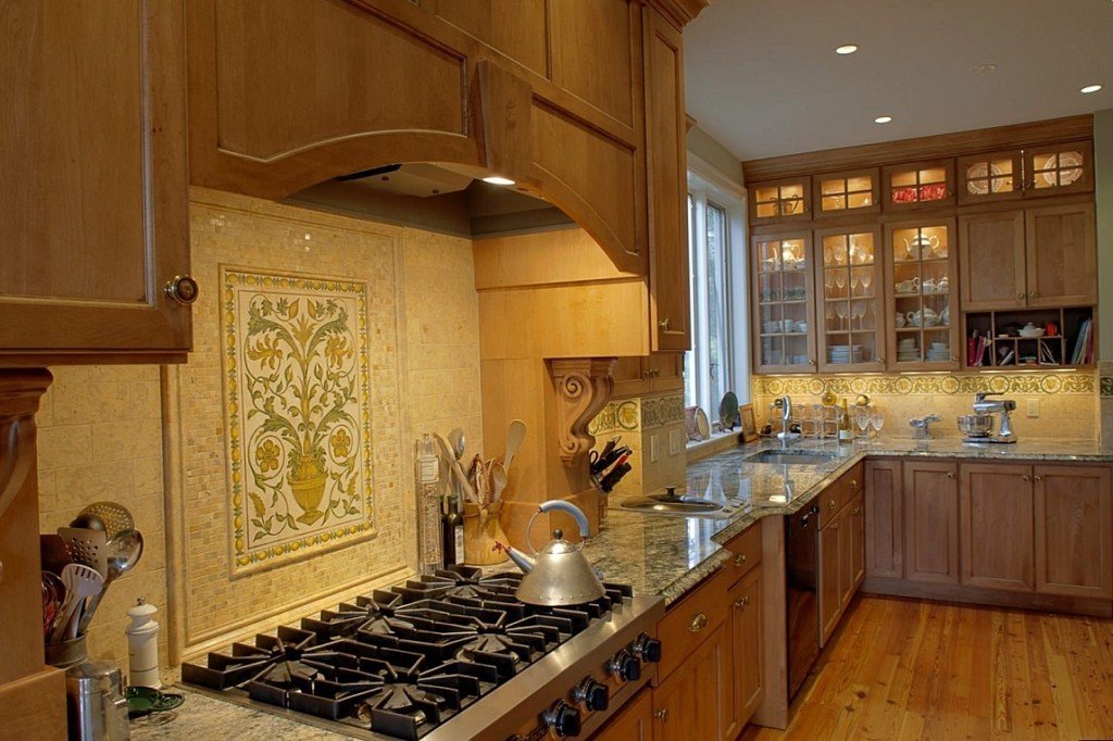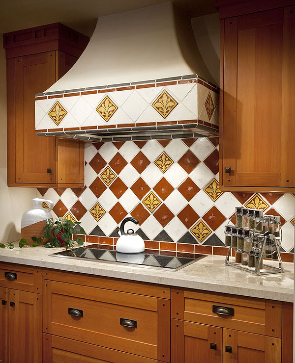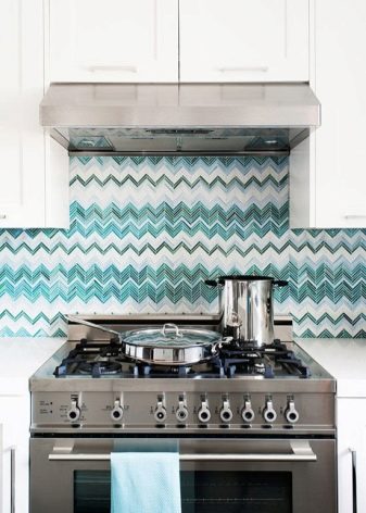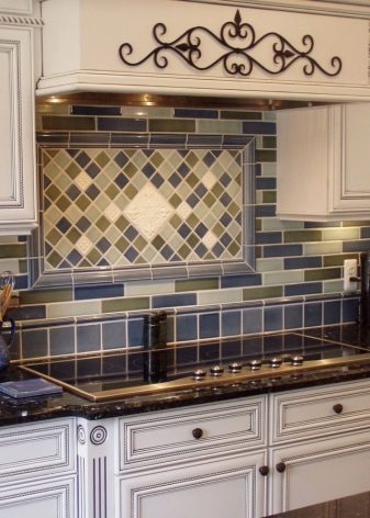 It happens that the cooking surface is located separately from the main furniture group, or the upper space between the wall cabinets is not completely filled (with special projects of induction plates or at the request of the owners). In addition to modular hoods, a fireplace system can be used in private homes. In these cases, it is recommended to lay a cloth apron around the hood and additionally protect the surrounding area with ceramic, plastic or glass tiles that will complement the main apron or make it a beautiful contrast within the overall design. Tile put on 5-10 cm (depending on its size). When using other materials under the hood, the apron goes 1 cm up and 3-4 sides.