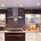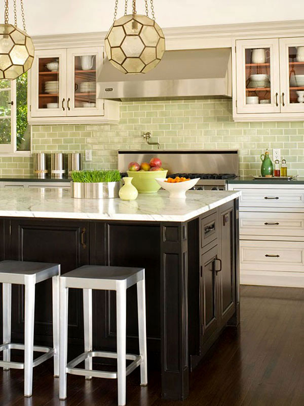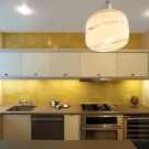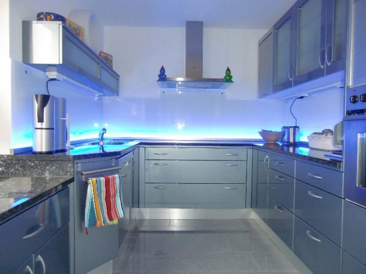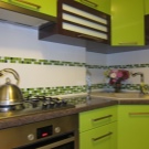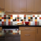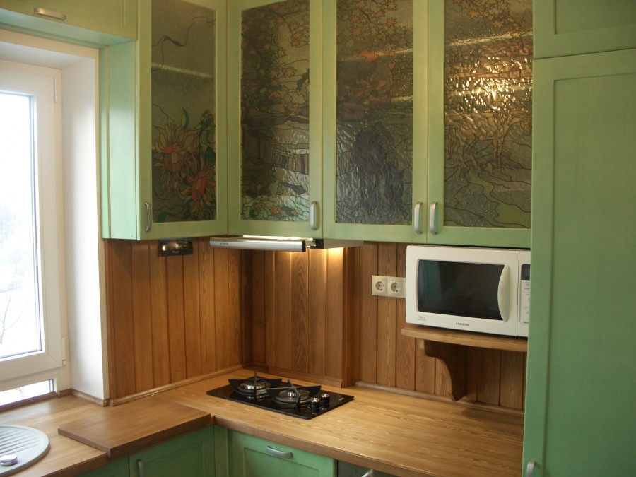 - Glass.This is a modern solution for arranging an apron. It uses frosted, clear or tinted glass. To create an unforgettable interior, you can place any photographic images under the glass and organize interesting lighting. Installation is easy, but there is one nuance. The wall must be perfectly flat, otherwise the glass may burst when installed. It is necessary to clean such an apron often, since all splashes, even from simple water, immediately become visible. Also, over time, scratches appear on it, and it will need to be replaced.