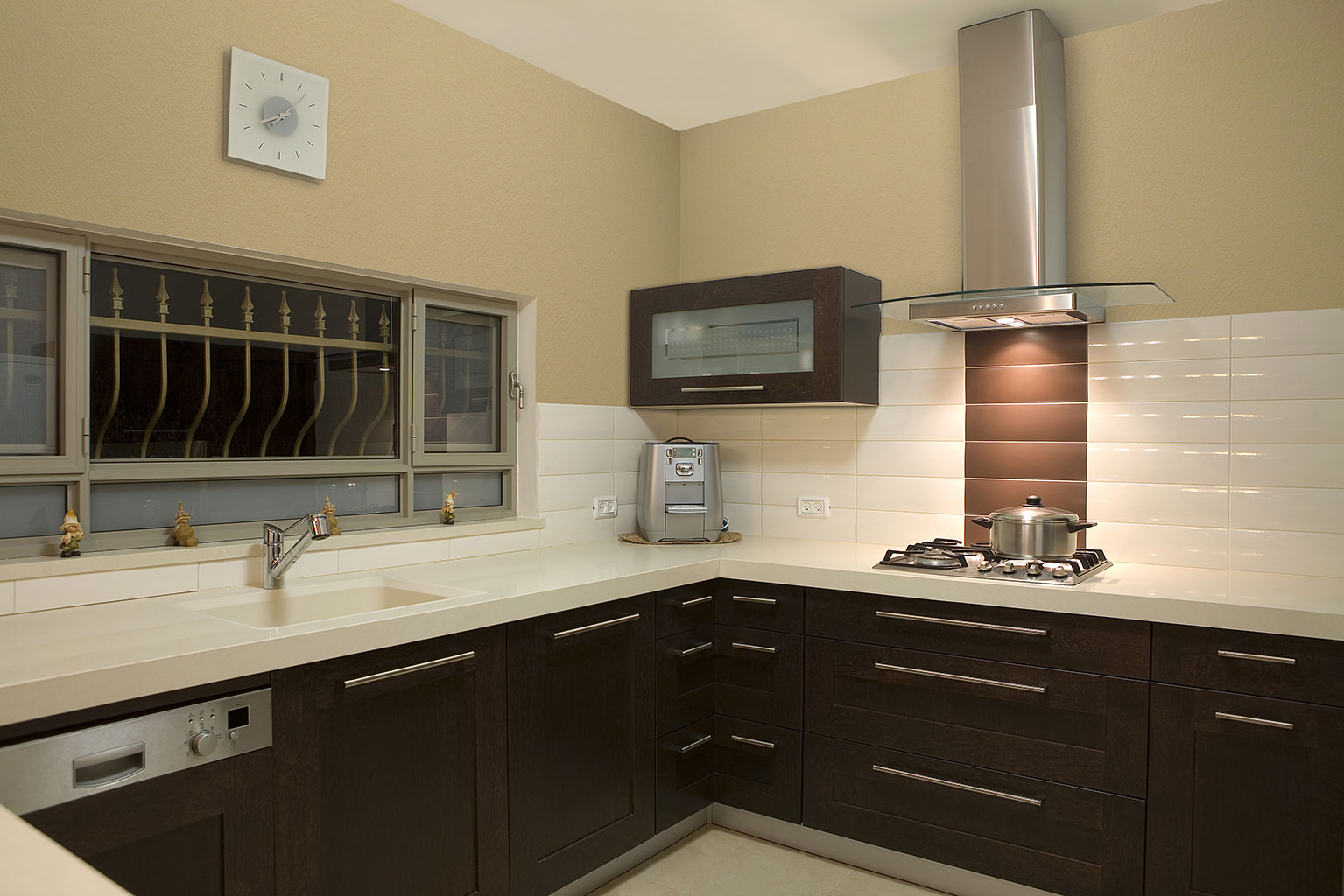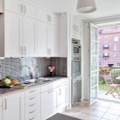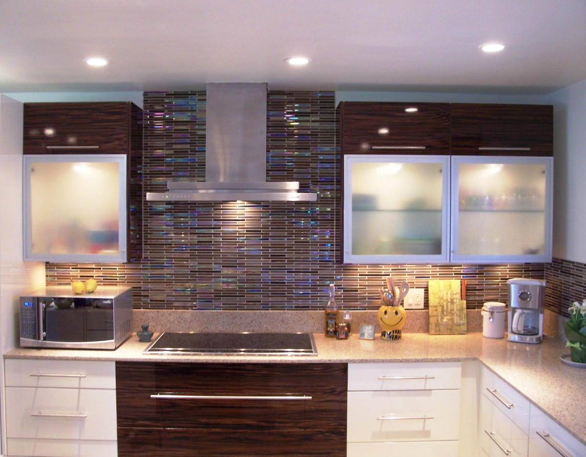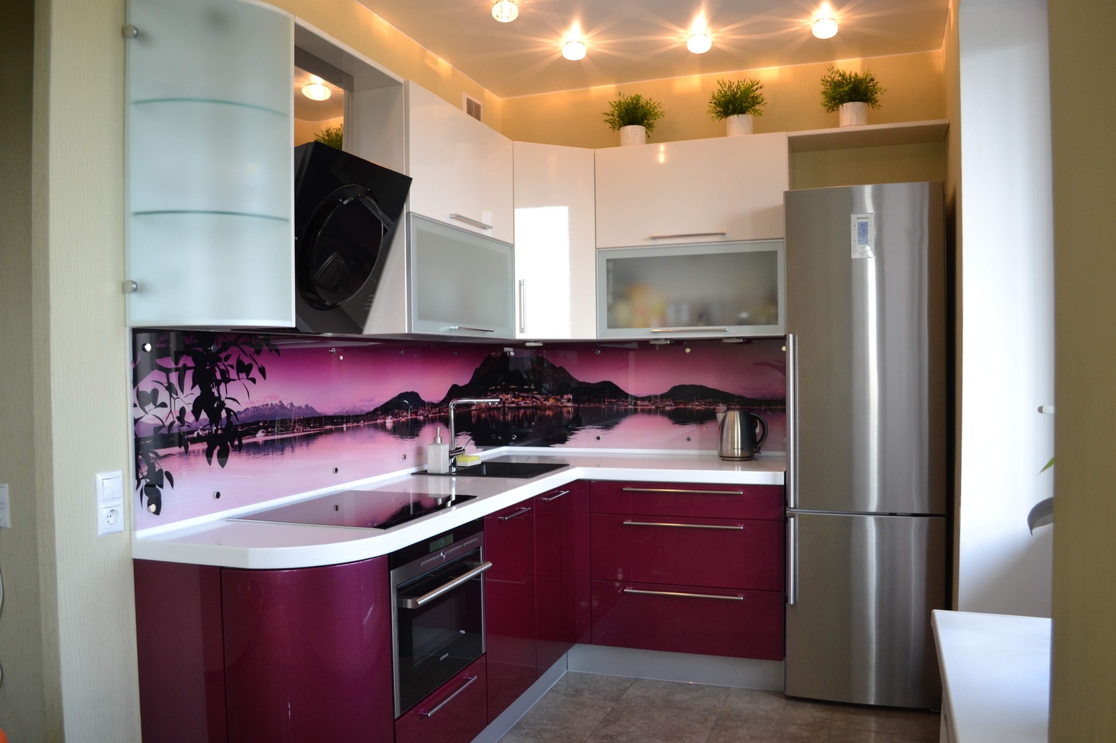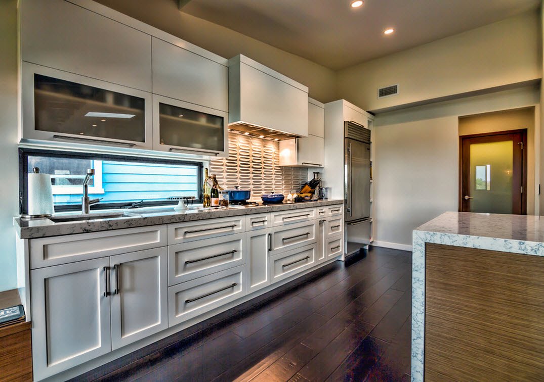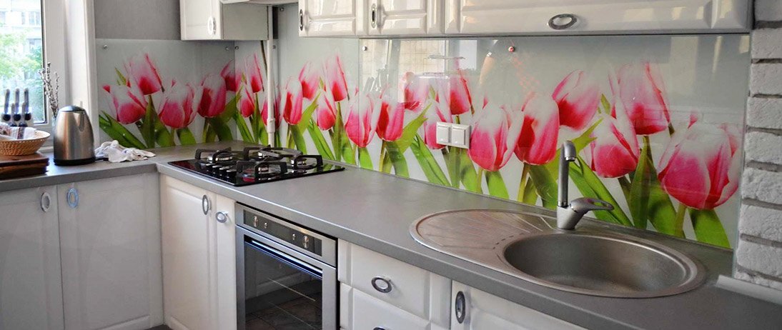 Initially, you need to perfectly align the wall, since with the slightest unevenness during the attachment the glass may break. The corners, if the apron will cover them, must be strictly 90. You must install a panel of tempered glass near the cooking surface, this must be taken into account when ordering glass in the workshop. Be sure to have glass with a polished edge. Its width should be equal to the distance from the table top to the lower edge of wall cabinets with an allowance of 5 mm. The length can be up to 3 m with a glass thickness of 10 mm. Under it you can stick wallpaper or apply photo printing on the glass itself, but in a mirror image. Keep in mind that if you install a tempered glass apron, all the holes for the screws and sockets will need to be made on it in advance, as it will not be possible to drill it after quenching.