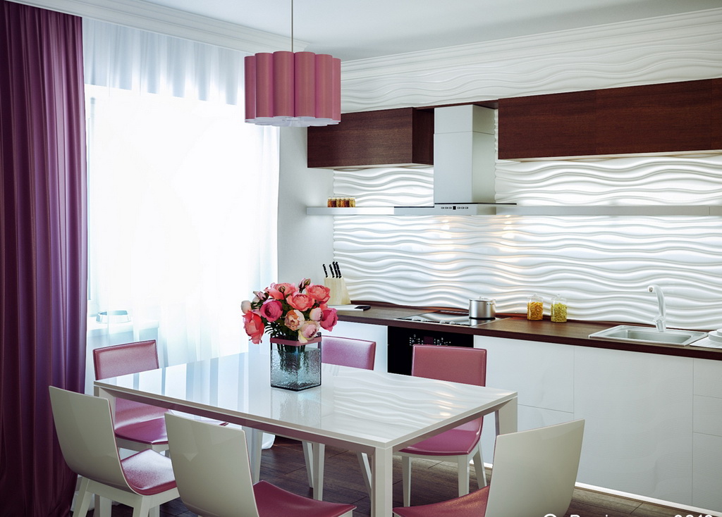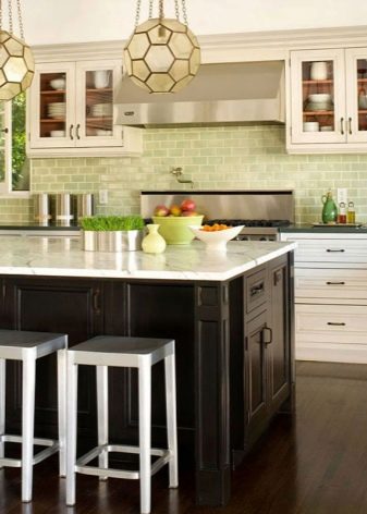 You need to choose an apron based on your desires and kitchen interior. It should not only be combined in style with it, but also complemented, making the picture of the kitchen complete.