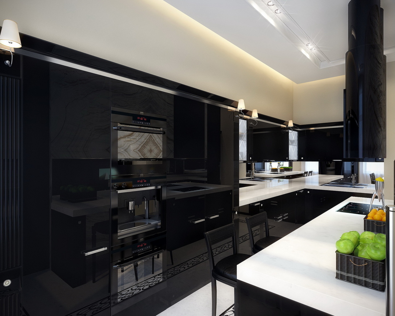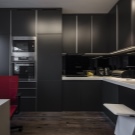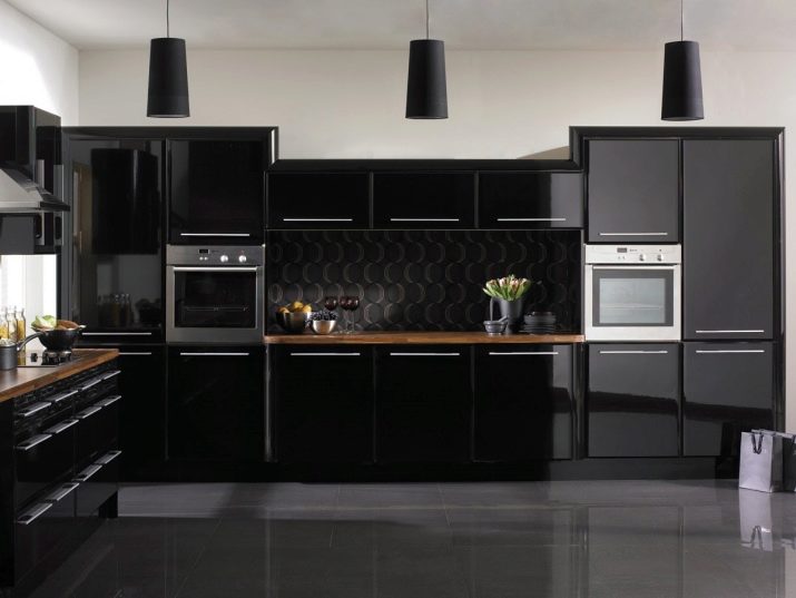 Black is especially appropriate in high-tech or minimalist kitchens. He is able to give elegance and sophistication to the interior, make it elegant.It must be remembered that in the black kitchen you will have to follow the cleanliness very strictly. It is a misconception that pollution is not visible on a black background. Even divorces from badly wrung rags will be noticeable more than on a light background.
