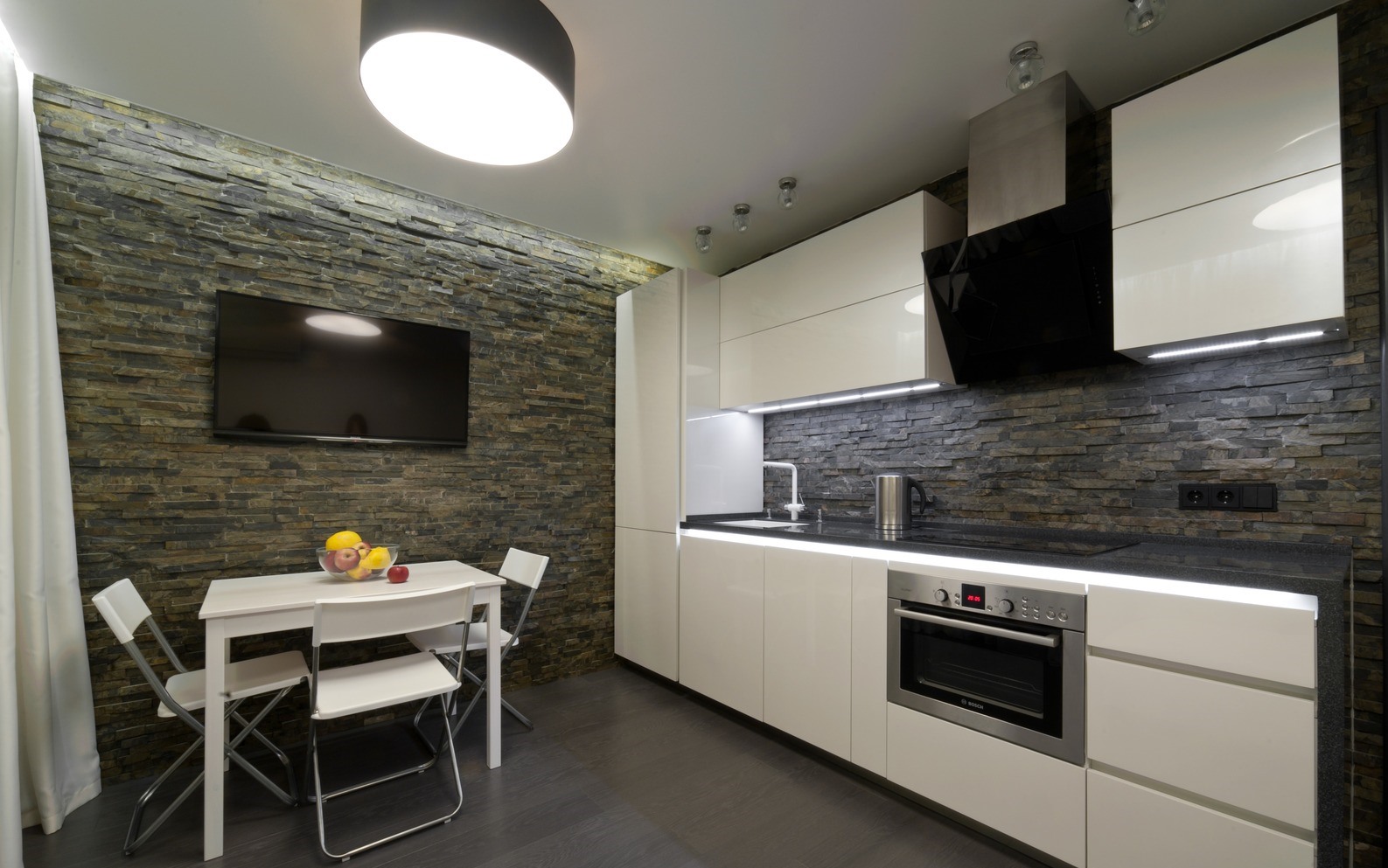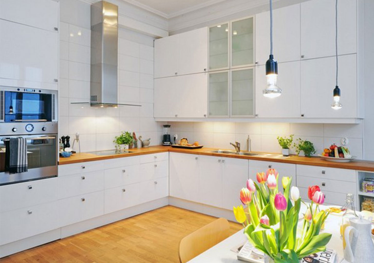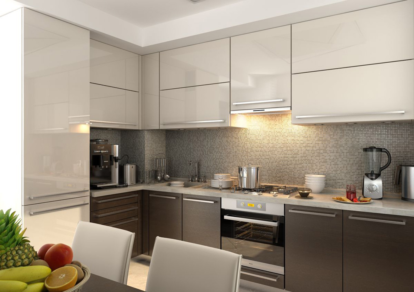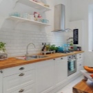 White is able to push the space, making the room visually larger. He seemed to fill the room with air, giving a feeling of lightness. White color perfectly harmonizes with all other colors of decors and finishes. This tone is a symbol of purity, so it looks organic in the kitchen. This color is the best solution for a small kitchen. However, a completely monochromatic design can cause discomfort. Therefore, the white color should be diluted by completing the interior details in other colors. It would be appropriate to highlight the work area. Highlighting an apron, you revive the room, making it more harmonious.