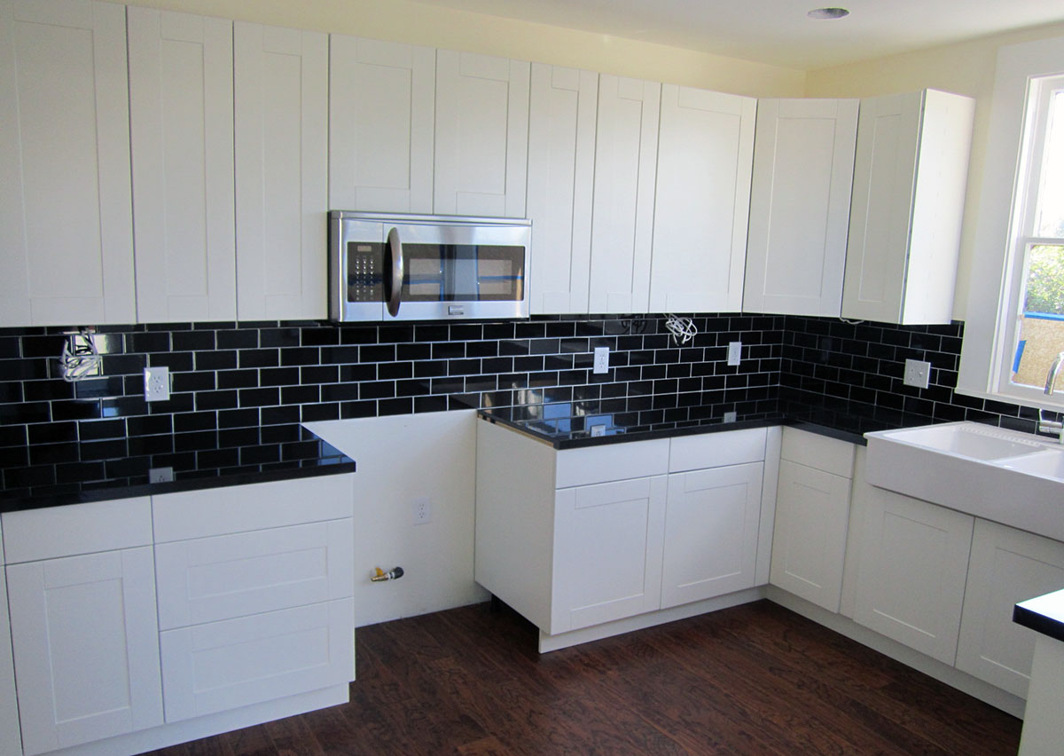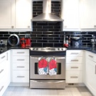A black apron will look good in a white kitchen. Combining black and white is a classic combination. It will give a sense of dynamism, relieve from monotony.Such a solution is suitable for any style. It would also be nice to add a couple more accents. Black worktop, black finishes and decors will make the kitchen stylish, geometrically clear, will give harmony. The final touch in black and white design will be the floor, lined with black and white tiles. One option may be a chess pattern. However, designers will certainly offer something more original - modern manufacturers produce tiles with different patterns.