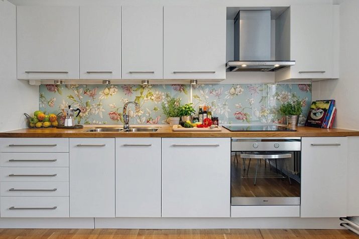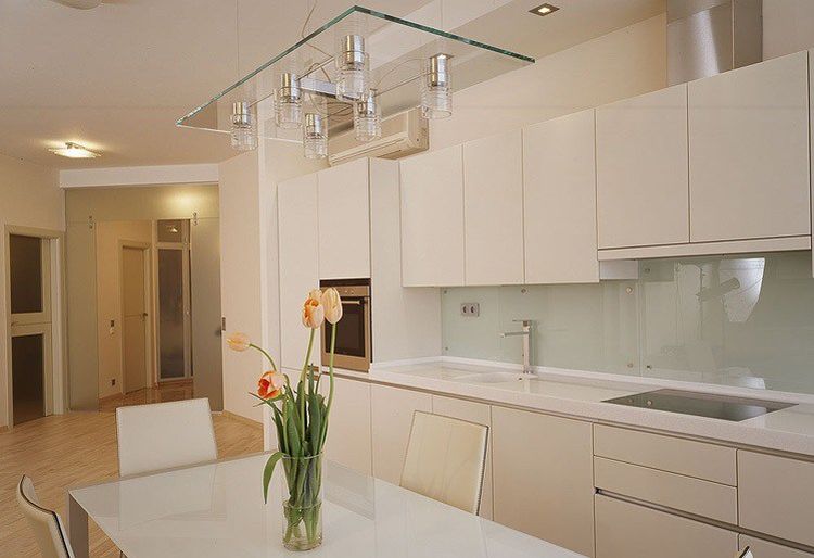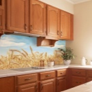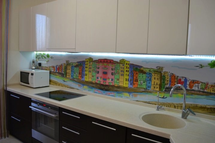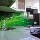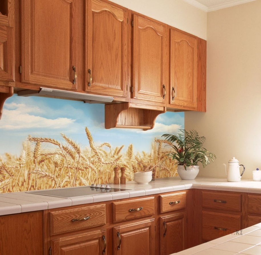 A variety of glass paintings allows you to choose the option that best fits into your kitchen space. By its strength, tempered glass is only slightly inferior to ceramic tiles, it is absolutely safe when accidentally cracked. A solid glass sheet is much easier to assemble than each tile individually.