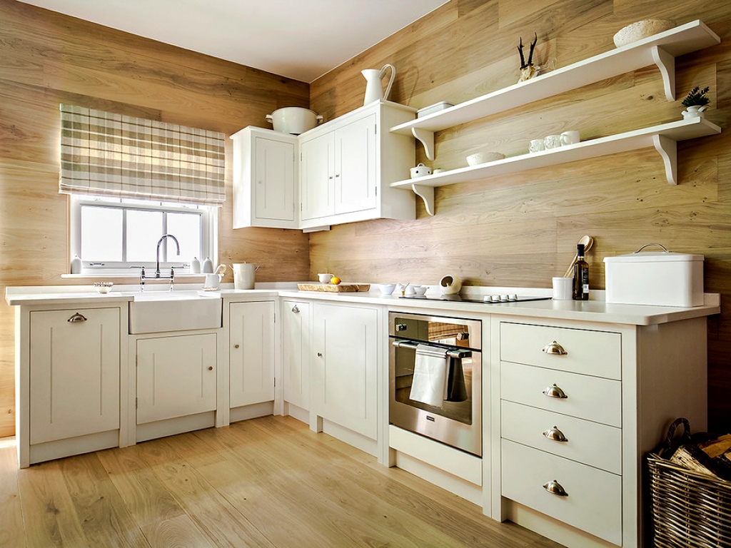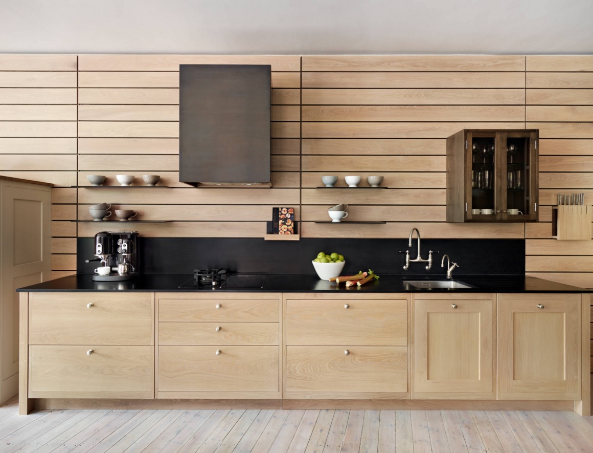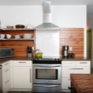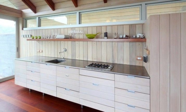 Wood reacts poorly to an open fire, so for the kitchen with a gas stove such an apron will definitely not be the best option. In addition, the tree is able to lose its properties and impeccable appearance when exposed to water.Of course, your apron will be treated with impregnation and varnish, but you should still minimize its contact with water. If you finally decided on an apron and you want it to be made of wood, then you can combine it. In the problem area, install a protective panel of a more practical option, and leave the rest of the area under the wooden sheet.