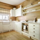 Chipboard - natural material, which is a laminated pressed sawdust. The chipboard apron is significantly inferior in its characteristics to ceramic tiles, but it looks quite attractive. But if you use this material as a kitchen apron, then note that it will not last long. This is due to the fact that the laminated panel is afraid of moisture and fire. With constant exposure to water, the material will swell and lose its shape.