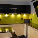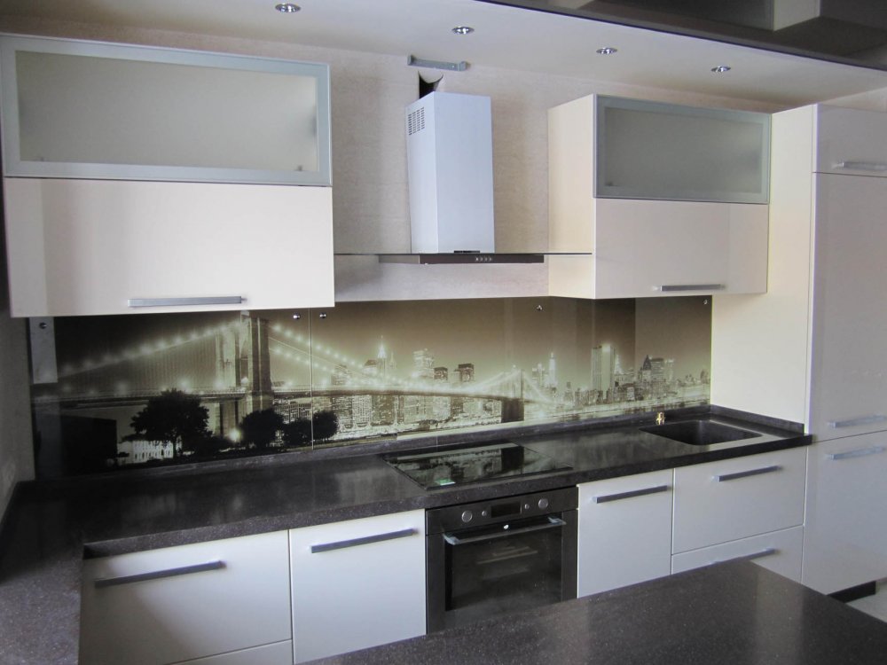 The apron from the tempered glass possesses a large number of positive qualities. The glass surface is completely indifferent to the effects of water and fire, so your favorite gas stove will not interfere with its installation. The glass version of the protective surface is hygienic, resistant to bacteria, easily cleaned with even the most aggressive detergents.