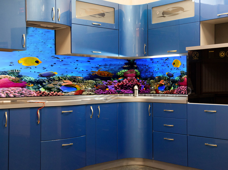 Acrylic panels allow you to put on them absolutely any pattern. For example, you can create a masterpiece in the form of an aquarium, making your kitchen unique and lively.