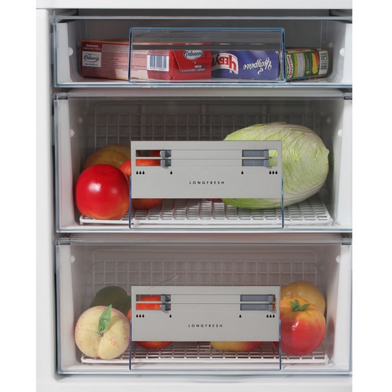In the freezer there are three convenient compartments for storing meat and fish products. On the outside of the door there is an indicator with control buttons and temperature control. Independent cooling system "TwinTech" for two cameras allows you to maintain the desired temperature and humidity.