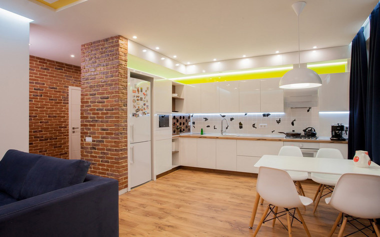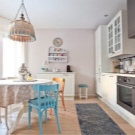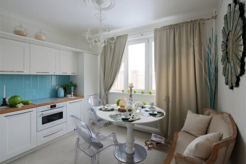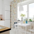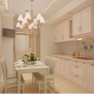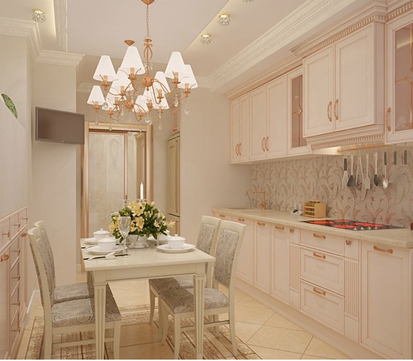 - If the dining area is made entirely in white or some similar color, you can create accents, “playing” with textures, as mentioned above, or with decor and patterns. An interesting option would be the use of white wallpaper with a complex ornate ornament, you can still advise to hang curtains with a fancy canopy. The flooring may be the next variation. In this case it will be especially interesting to experiment with tile, which is represented in the widest range. Among it you can find intricate patterns that can give the kitchen dynamics.