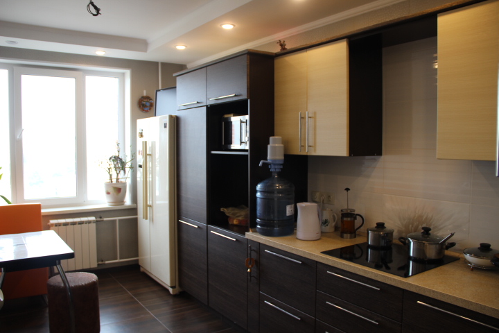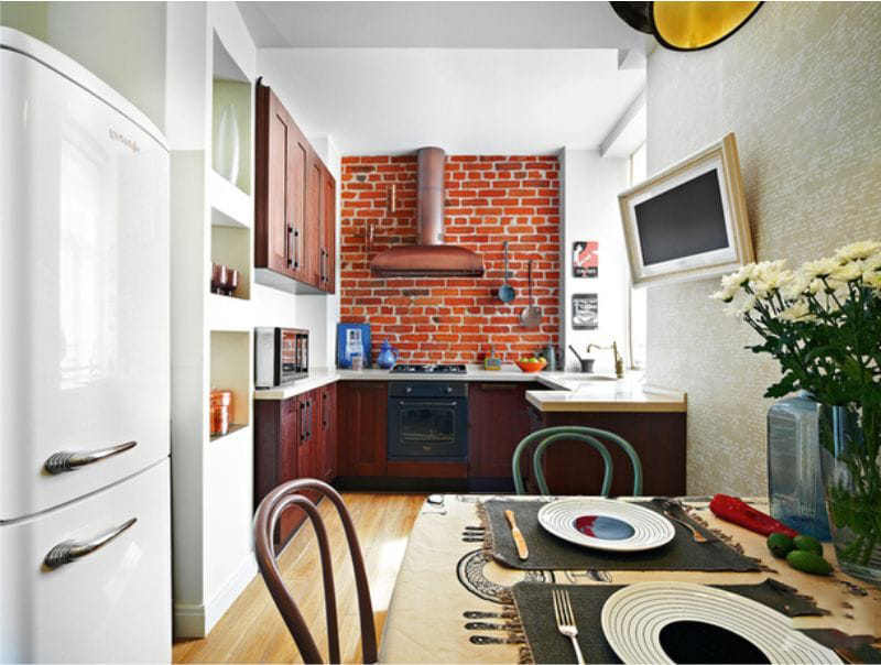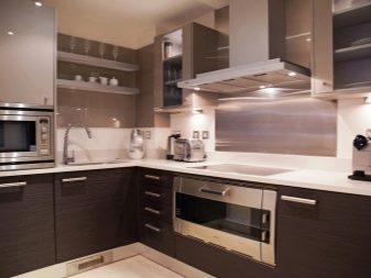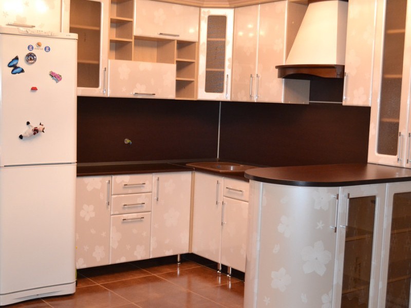 If the working surfaces of the kitchen unit are made in chocolate or brown tones, then an excellent option would be to make furniture fronts, a refrigerator and other devices in ivory tone. This shade will have a direct impact on the perception of space: either it will actively perform in the interior, creating a contrast, or it will become a soft addition to the design of the kitchen.