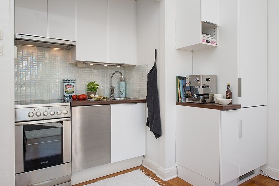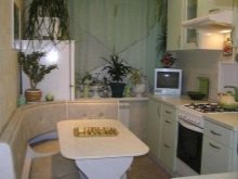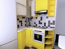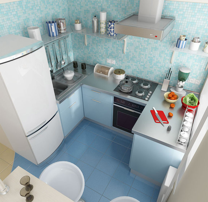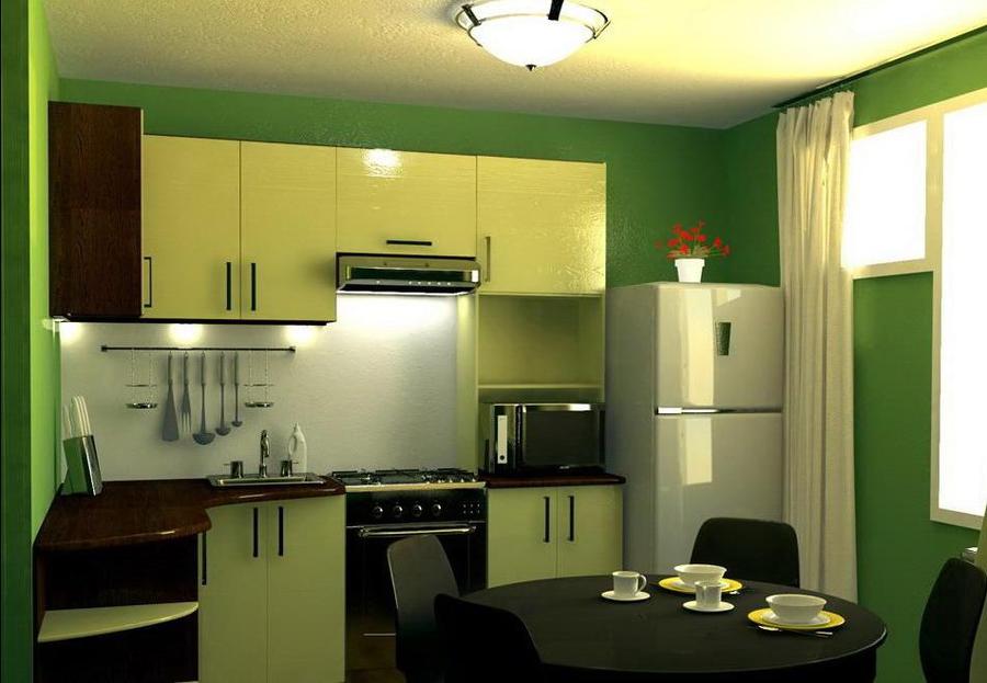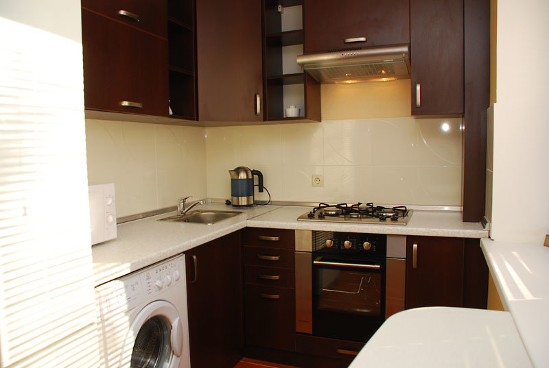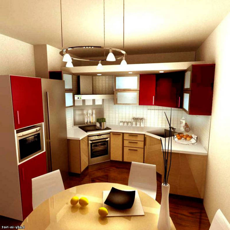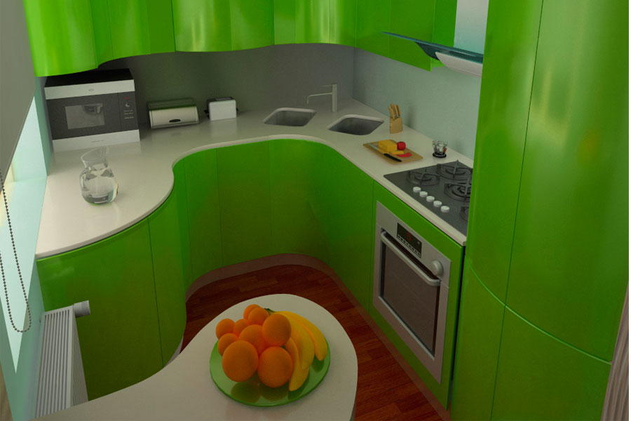 Corner location a kitchen unit is the most successful furniture for such a small room. Such an environment will make it more comfortable and ergonomic.