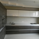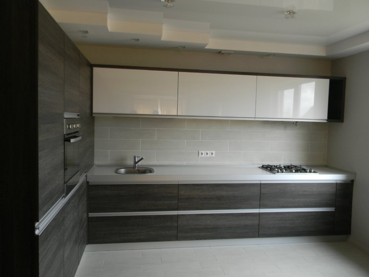 - Kitchen in modern style with a fridge in a niche made of plasterboard.