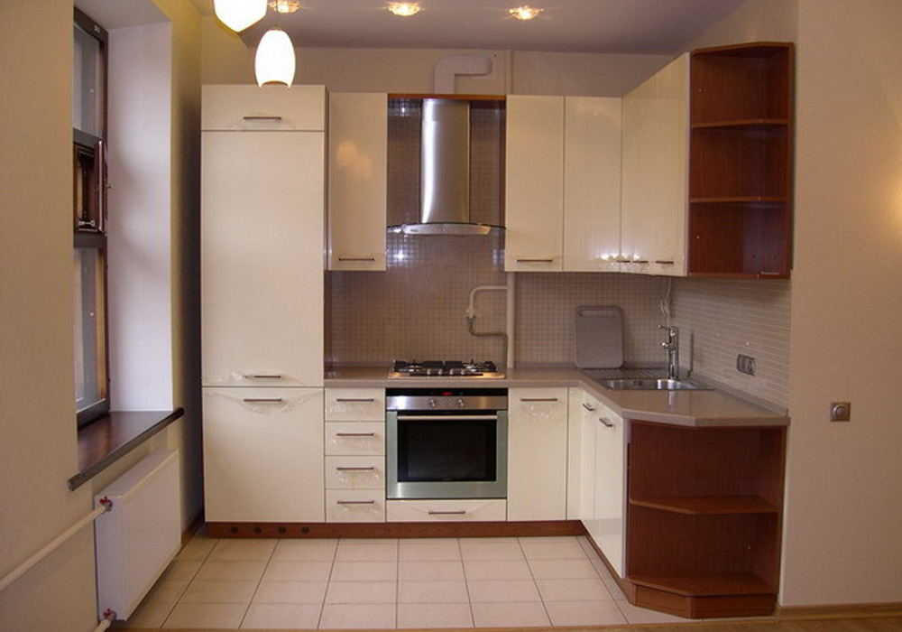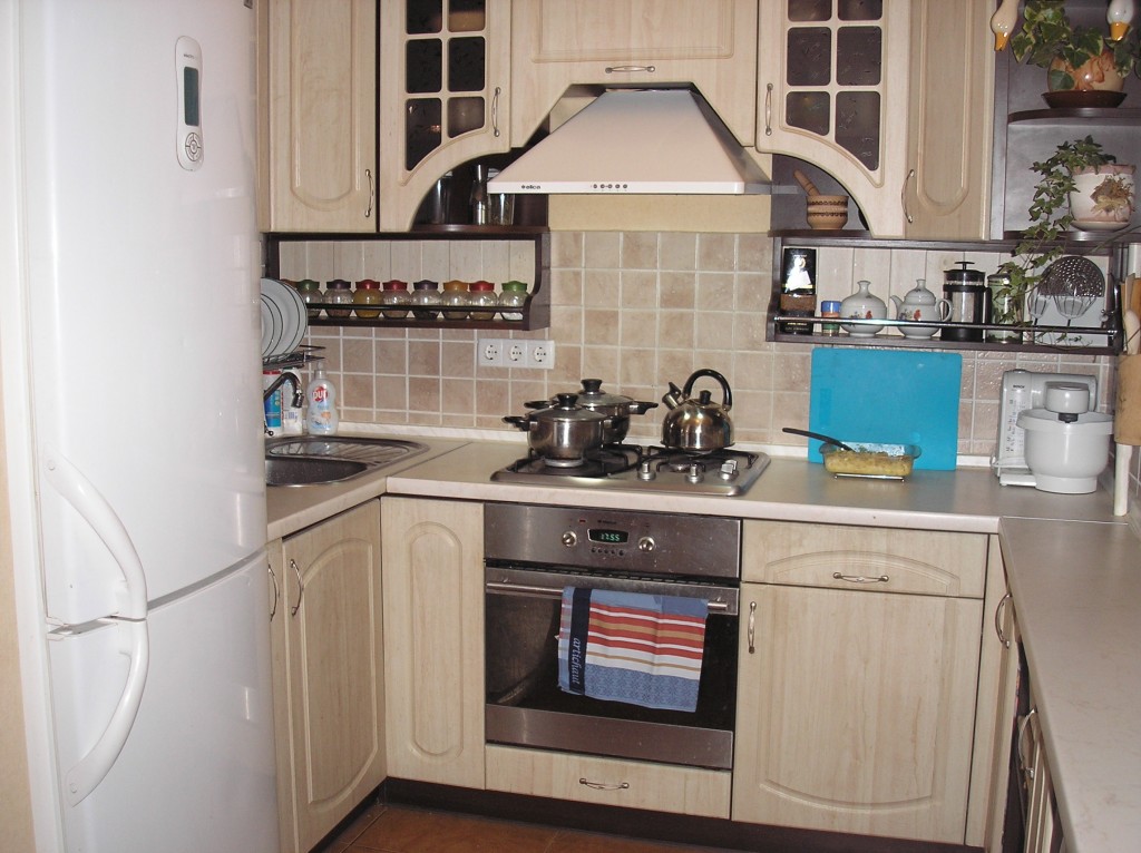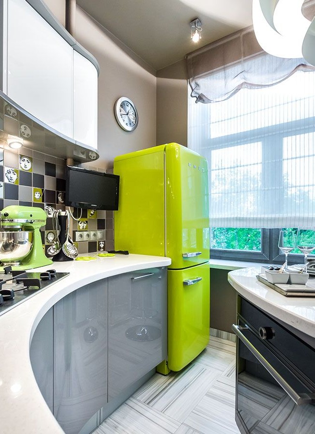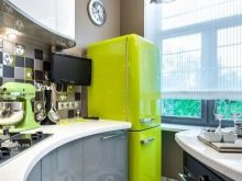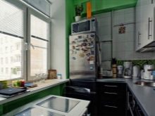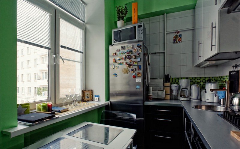 A great option in a small kitchen would be a fridge built into the kitchen unit. It can also be placed, as usual, and can be installed, for example, in the subwindow zone.