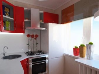 In the kitchen, combined with a balcony, an excellent option would be to place a refrigerator on the loggia. It forms a very convenient niche between the window and the side wall of the balcony.