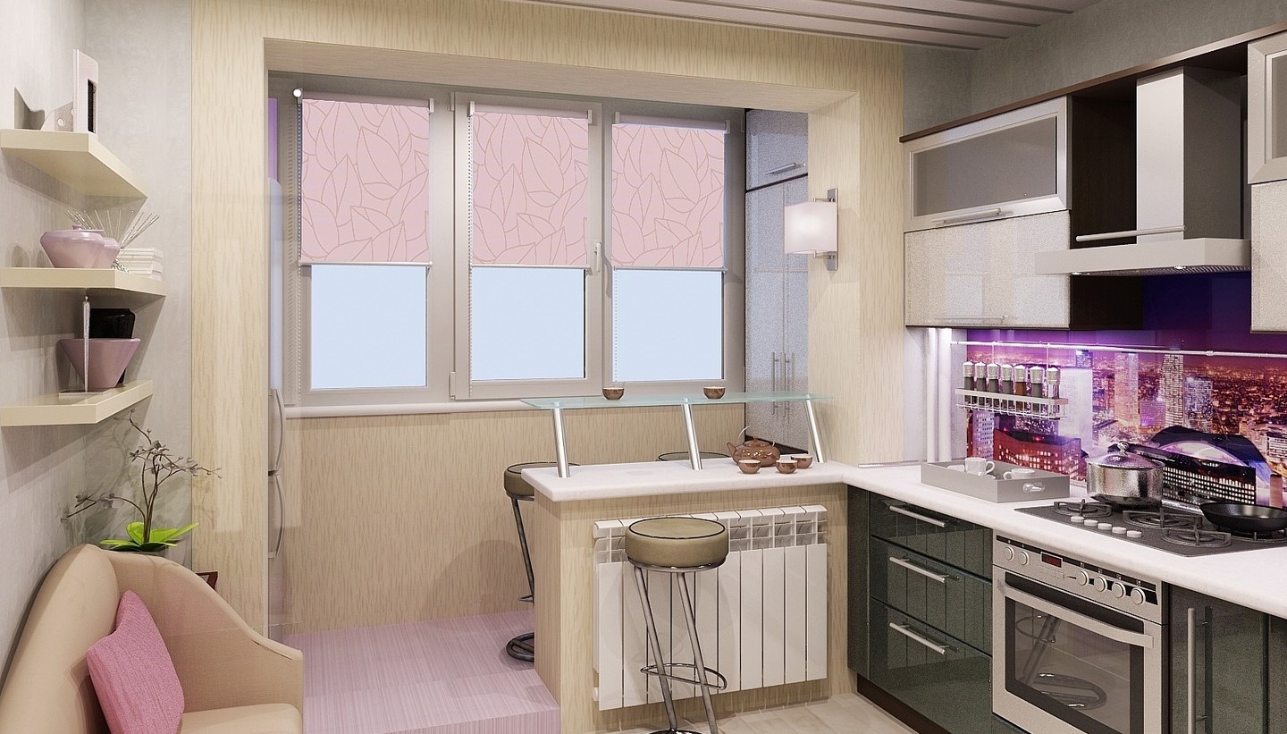 A great option would be if you have access to the balcony from the kitchen, you can attach it to the kitchen room, warm it up before it, remove the frame and organize a bar counter-table on the windowsill, thereby saving space in the kitchen itself.