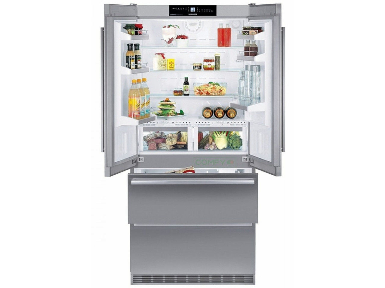 - Special compartments for storing perishable goods. These are the so-called “zero chambers” or “freshness zones”, prolonging the shelf life of greens, vegetables and fruits, fresh meat, fish, cheeses by maintaining a special microclimate and the right temperature inside the zone;