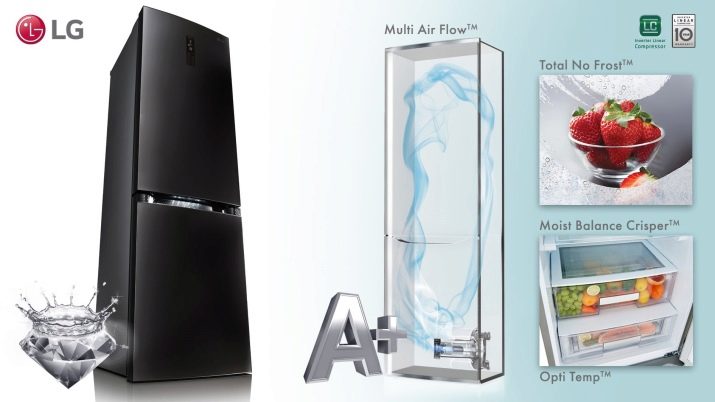 All LG 2-chamber refrigerators are equipped with a no frost system. This means that the freezer does not require defrosting, and the temperature inside the refrigerating chamber varies by 1-2 degrees depending on the level of the shelf.