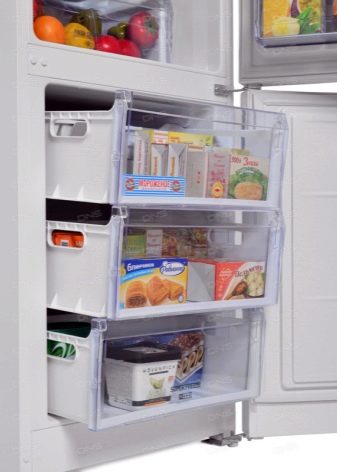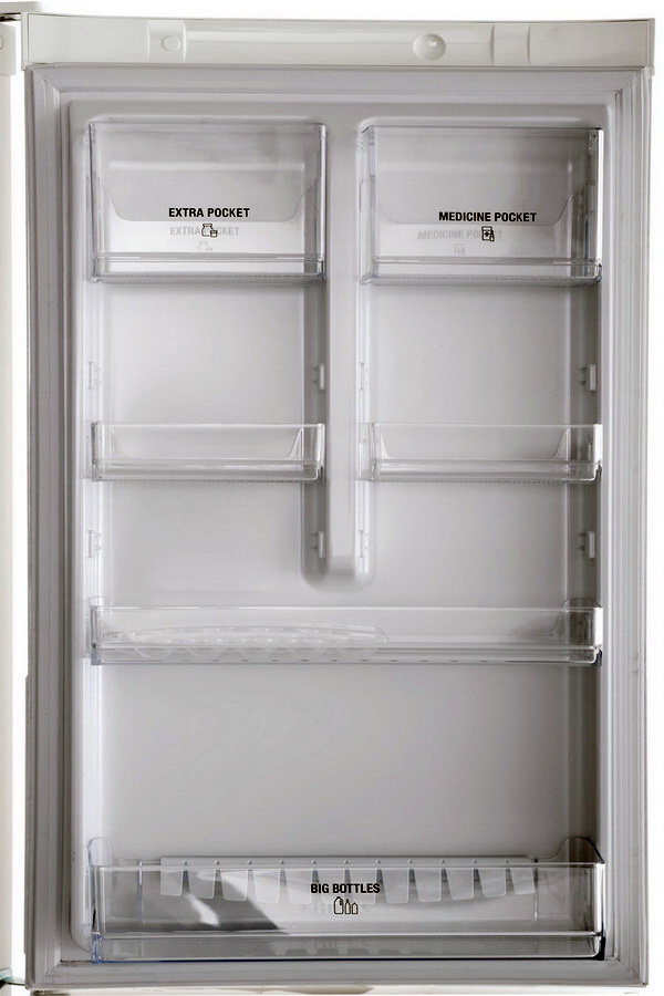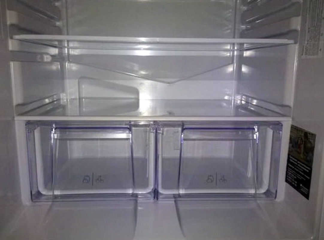 Of the four shelves in height, it is possible to adjust not two, but already three - the manufacturers took into account the flaw in the previous model and eliminated it. The door is all the same correct, with balconies and compartments. In the freezer the same three drawers with a total volume of 75 liters. Not much, of course, but meat and semi-finished products are not stored in very large quantities where.
