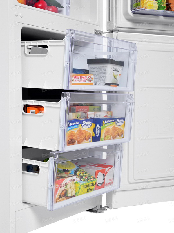 The unit refers to the average price segment. The freezer is located at the bottom and has rather modest dimensions. Three boxes with a capacity of 25 liters. Everyone decides for himself - this capacity is suitable or not suitable. A small amount of products to freeze really, but large blanks just do not fit. Pleases in this model the function No Frost and the mold for the preparation of ice.