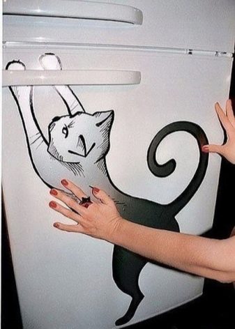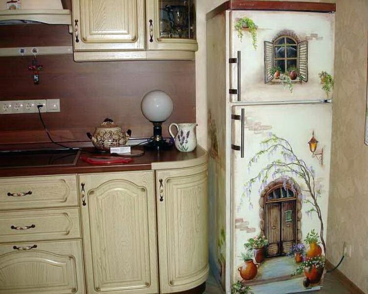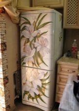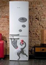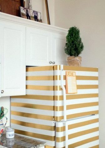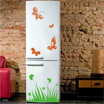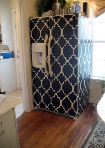 The correct solution would be to decorate the refrigerator using vinyl film. Today, there is a large selection of self-adhesive material.It is presented in various shades and textures, as well as with the use of print elements. The main advantages of vinyl are durability, high wear resistance, reliable protection from environmental influences. Vinyl film is the most suitable option for pasting the refrigerator. It is easy to use, anyone can work with it. Thanks to this type of decoration, the old refrigerator will quickly turn into a chic "handsome" with a surface under the velvet, marble, wood.