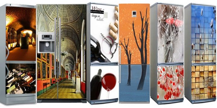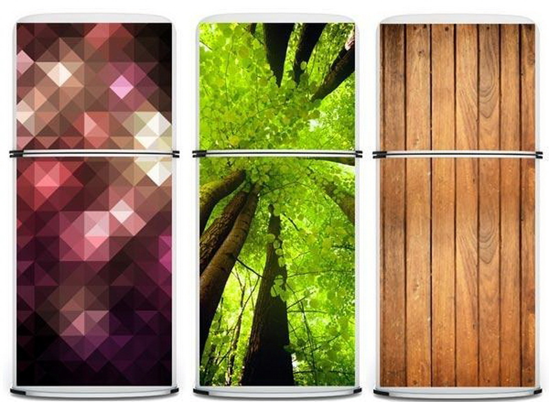 Recently, self-adhesive material with photographs, ethno-motifs, flower arrangements and images of animals is in great demand.It is possible to acquire self-bonding both in a single-color design, and in various colors - it all depends on the overall kitchen interior. For lovers of modernity, decorating a refrigerator with a film with a wave-like surface or with patterns in the form of squares and diagonal stripes will be the right decision. If the kitchen is decorated in the style of classics and is filled with wooden furniture, a great option is to glue the refrigerator under the tree.