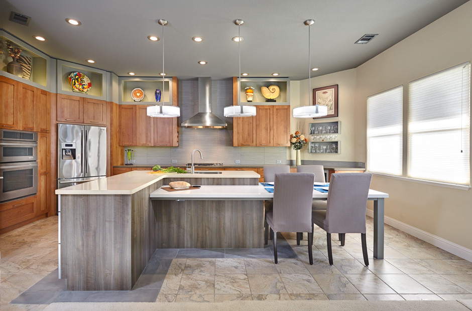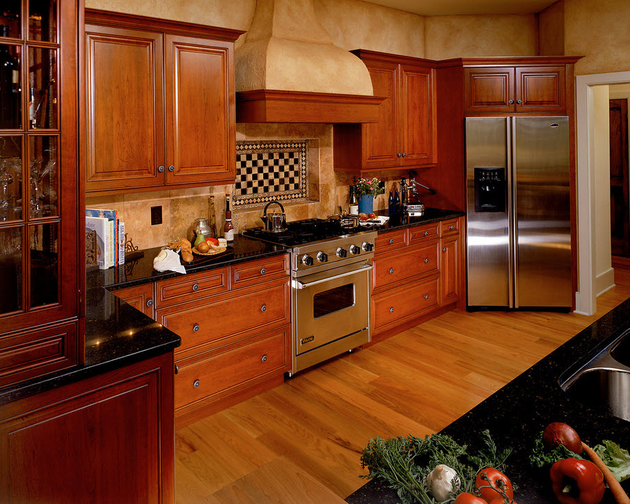 The high-tech style is ideal for the use of refrigerators: the combination of the steel surface of household appliances and wooden furniture, diluted with bright "stains" of bar counters, lamps, stylish dishes, is always in trend. If the decision to purchase a corner refrigerator was caused by the desire to free up space in the kitchen, then you can use some more design techniques for this purpose: