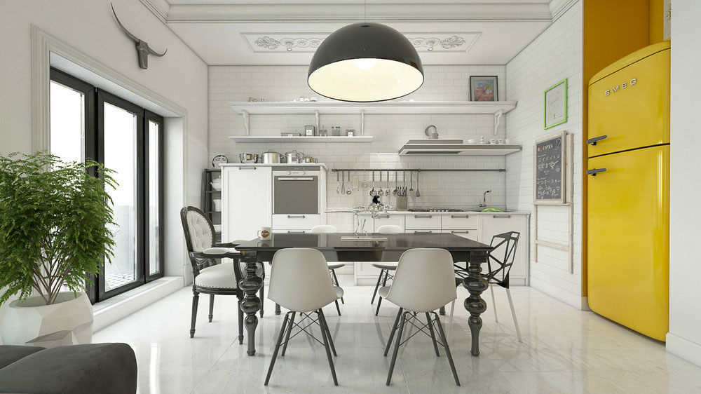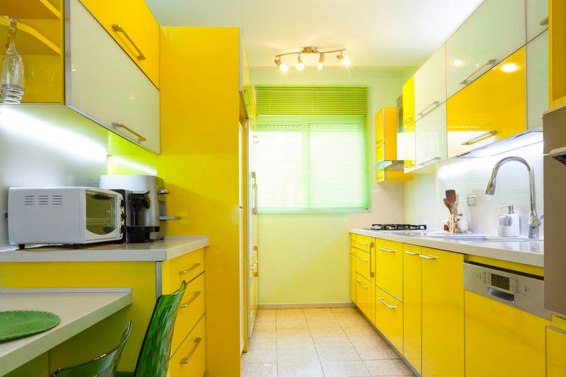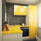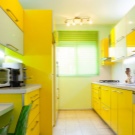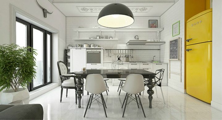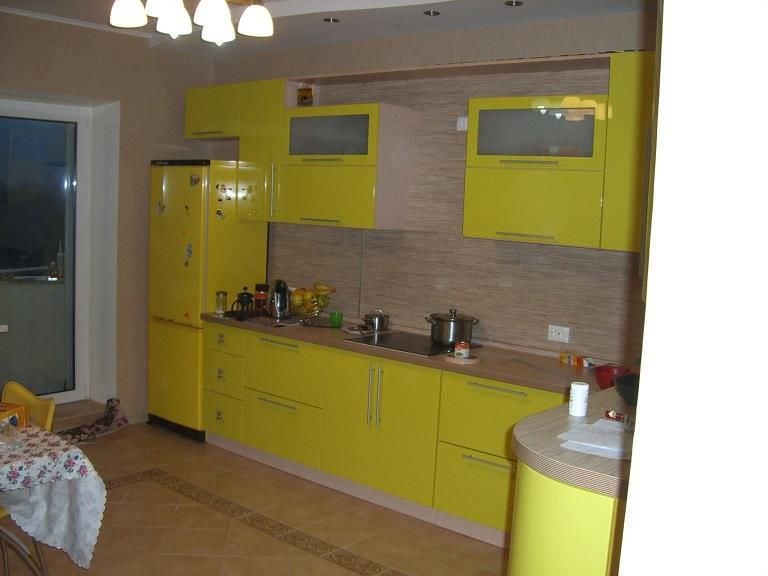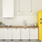 It may be the only bright element in the interior. Or it can be supplemented by a built-in wardrobe of a similar shade. Also, the yellow device will look great on the background of stylized brickwork or a wall made under a tree. Not only bright rooms are suitable for a bright refrigerator. It will perfectly fit into a dark interior.Vertical surfaces, as well as kitchen cabinets and cabinets can be made in black, dark blue or dark green palette.