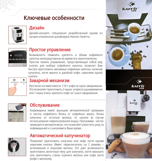 The most popular model is the Kaffit.com coffee machine model “Nizza AutoCappuccino”. You will quickly realize that she is pretty good — at first glance.Nice (not too catchy) design, classic shape. Such a machine looks quite professional, but it’s much more important that it can. And in this regard, the device can be commended for much: