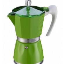 - Geyser. There are electric and non-autonomous (bask on the stove). The design of such devices consists of two sections, between which there is a special filter. The bottom is filled with water, the coffee is placed in the filter. Water boils and steams seep through the coffee, saturates it and accumulates in the upper compartment, from where the drink is poured into cups. In the assortment there are models with different capacities and volumes of compartments, which allows you to choose a unit that prepares coffee for one person or for the whole family. The quality of the drink is quite high, but the disadvantages include the need to monitor the amount of grinding, as too small particles clog the filter.