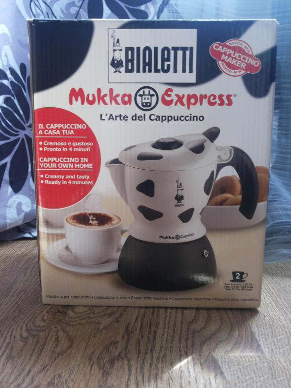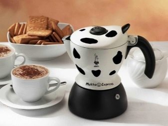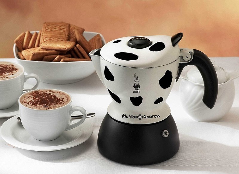The coffee maker of this model consists of three classic elements, but has a non-standard appearance. The upper part of the body is painted under the "skin of the cow" in white with black spots. In this original way, the manufacturer explained that cappuccino can be made in his car.