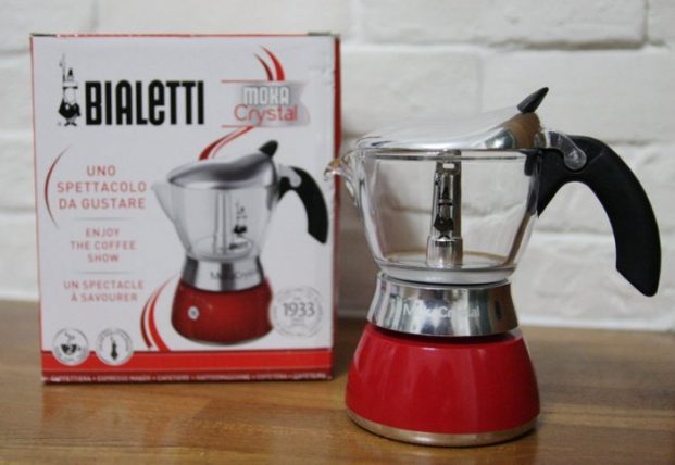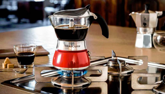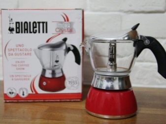 A small red coffee maker, which is designed for 240 ml of the drink, which, according to the Italians, is 4 cups. It does not have any technical features, but the glass case allows you to accurately set the time that the beverage is ready and not allow steam to come out of the spout instead of coffee.