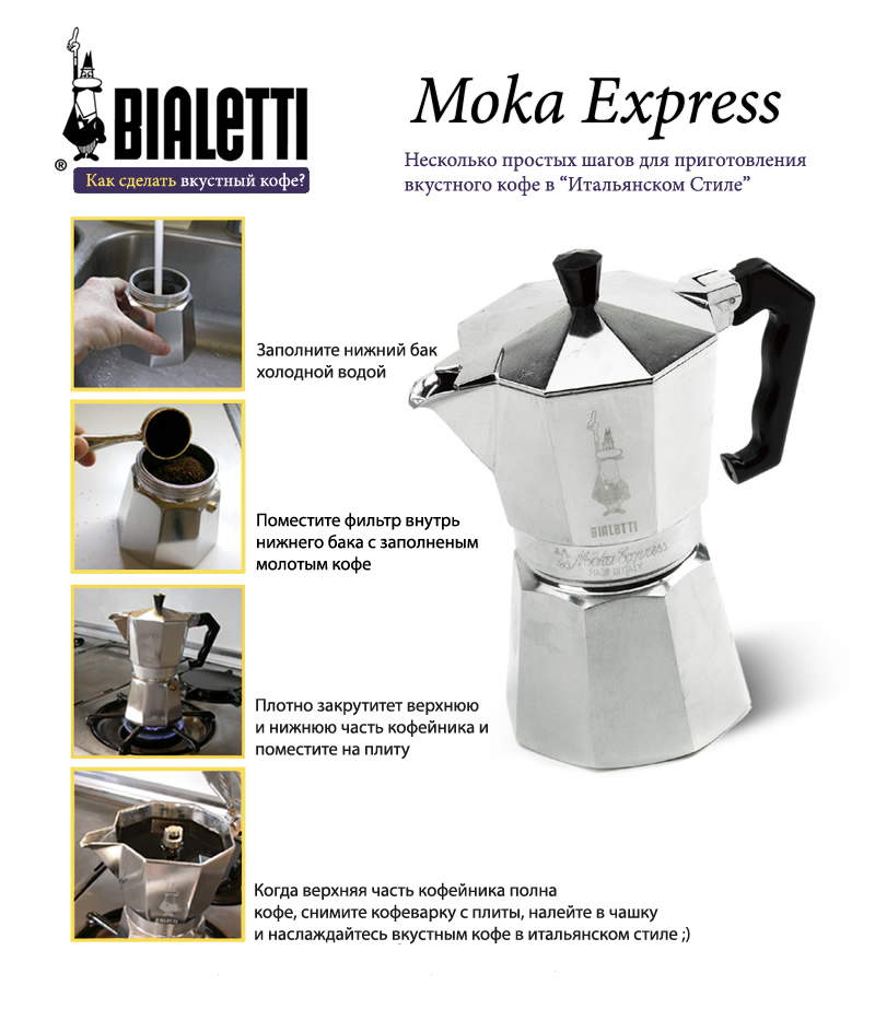Italians understand coffee the best in the world and it is not surprising that they became the ancestors of many types of this drink: espresso, cappuccino, latte, macchiato and others. It was in Italy that the first geyser coffee pot was born, which prepared the espresso simply and quickly. Given that the design of the aluminum geyzernaya coffee maker was simple, then its price was low, which made it accessible to the general population and brought great popularity. The creator of this coffee maker was A. Bialetti, therefore the appliance was named Bialetti or the Moka Express coffee maker (which is absolutely the same).