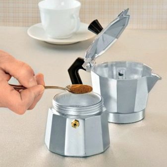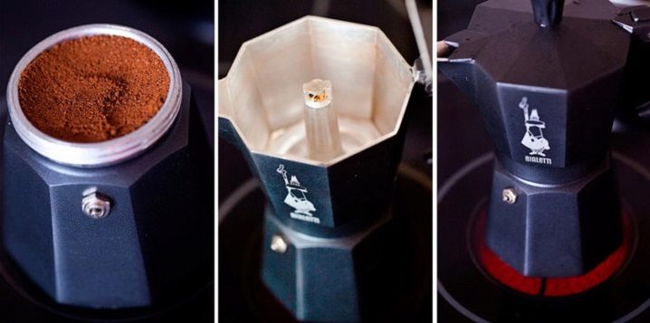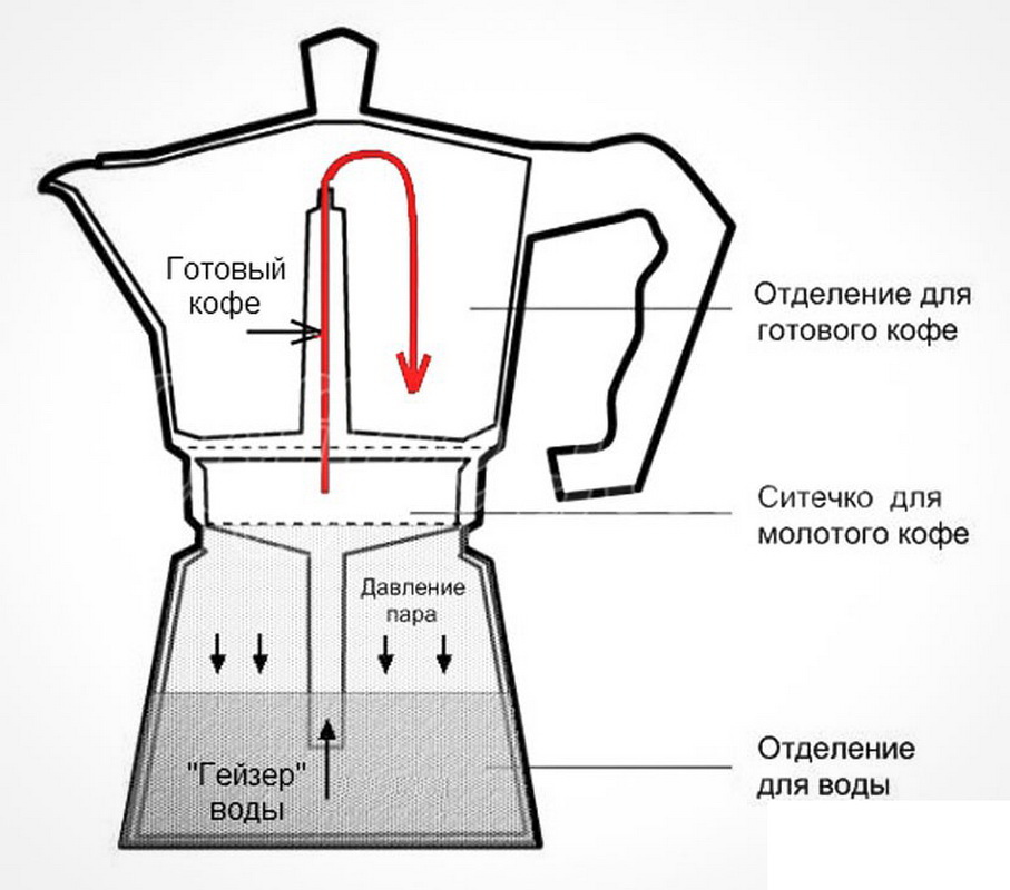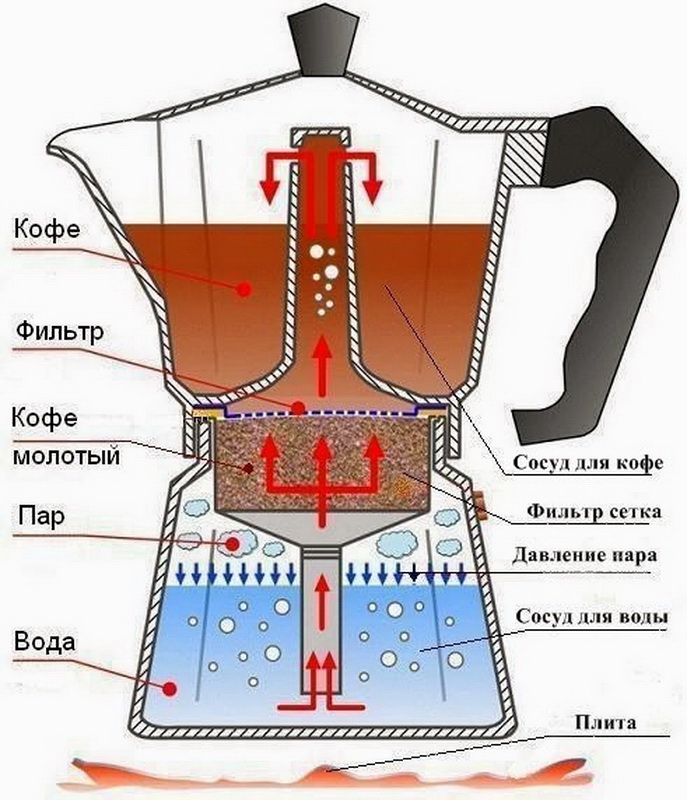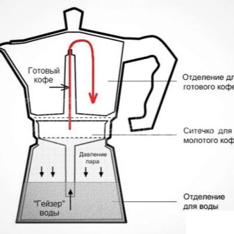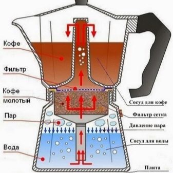 The required amount of cold water (not higher than the maximum mark) is poured into the metal container. The ground coffee beans are poured into the filter, and the container is installed at the top, where ready strong drink will be collected. Then the machine is connected to the network or installed on the stove. When heated, water turns to steam, which raises the remaining part of the liquid upwards. It passes through a coffee filter, where it is saturated with flavor and aromatic properties. Further, under the action of temperature and high pressure, the finished drink reaches the top. From the top capacity coffee is poured into cups.