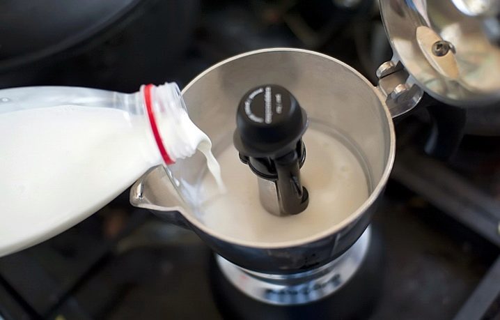 - In the upper compartment need to pour a little milk (if you pour too much, then it can splash when beating).