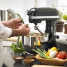 Another quite interesting and multifunctional stationary option is the model. KitchenAid 5KSM150PSE. Included is a bowl with a lid, which is used during operation. This is quite convenient during the cooking process, especially if the maximum mixing speed is on.The case of the model is made of metal, complete with special hooks for the test.