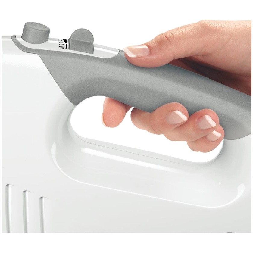 The bowl for beating products is made of high-quality and durable plastic. The peculiarity of the model is the availability of the capacity, which is able to rotate during operation. The mixing unit, if necessary, can be easily removed by holding the special button on the housing.