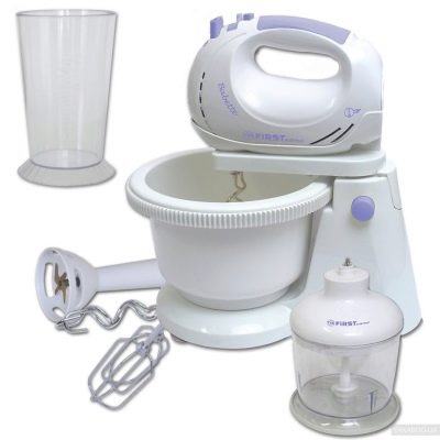 - This manufacturer is different in that it offers customers all kinds of mixers. These are both manual and household stationary and planetary models. Hand Mixer Model First FA-5257 gained wide acceptance among consumers due to its low price. This is a stationary model, the price of which ranges from 2,000 to 3,000 rubles. In addition, it comes with a blender attachment and a chopper, which can perfectly replace a meat grinder.