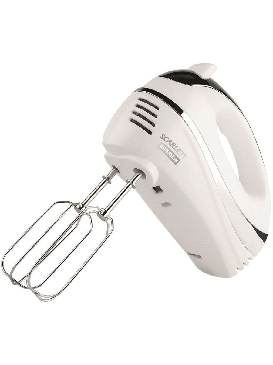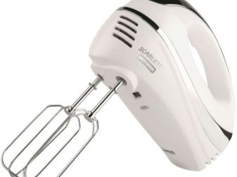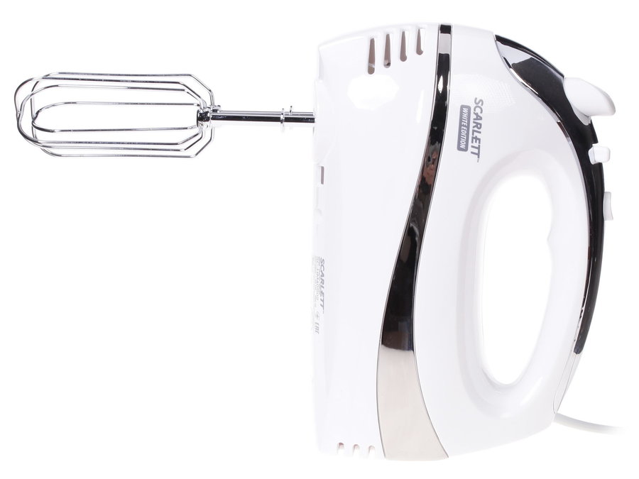 The 450-watt five-speed Scarlett SC-HM40S02 with turbo mode is a great low-cost option for those who don't bake very often. He copes with his direct responsibilities - kneads dough on a charlotte and cream. According to reviews, proteins turn into foam from 3 to 5 minutes depending on their quantity. Quite quiet, the corollas are short, so there are some difficulties with the selection of dishes for beating.
