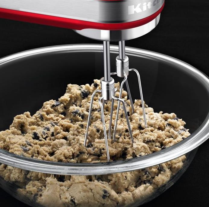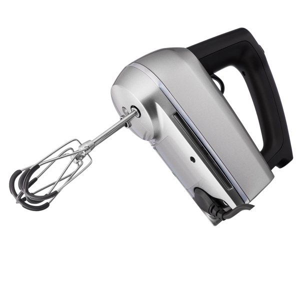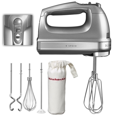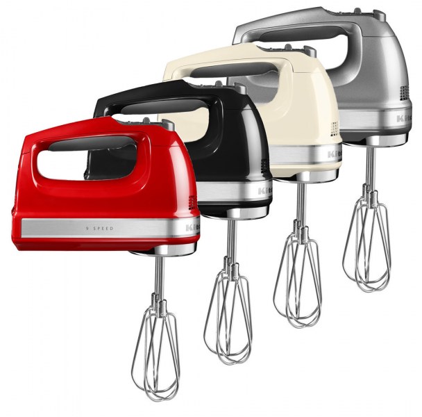 KitchenAid 5KHM9212ECU manual mixer is available in three color options: red, white and black. It has a DC power of 85 watts, 9 speeds and several nozzles for work: hooks for dough, 2 types of whisk and a blender for cocktails. After work, the cord can be wound into a special compartment, and not to take out the corollas with your hands, but to press the button and unfasten it without smearing your fingers.
