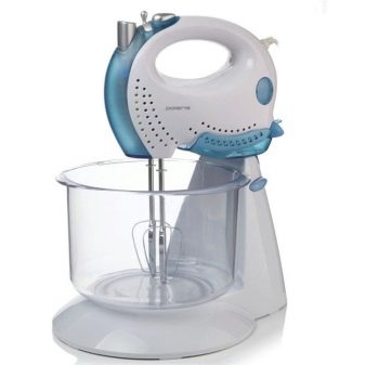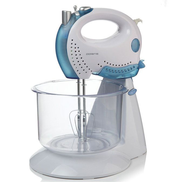 We can separately consider the model Polaris PHM 3006B blue, which has a low power of 200 W, but an expanded package: it includes a stand and a bowl. The peculiarity of the model is that the beaters practically reach the bottom of the bowl, which most mixers cannot boast. This greatly facilitates beating, the hostess does not have to mix the dough with a spatula, scraping it from the bottom.
